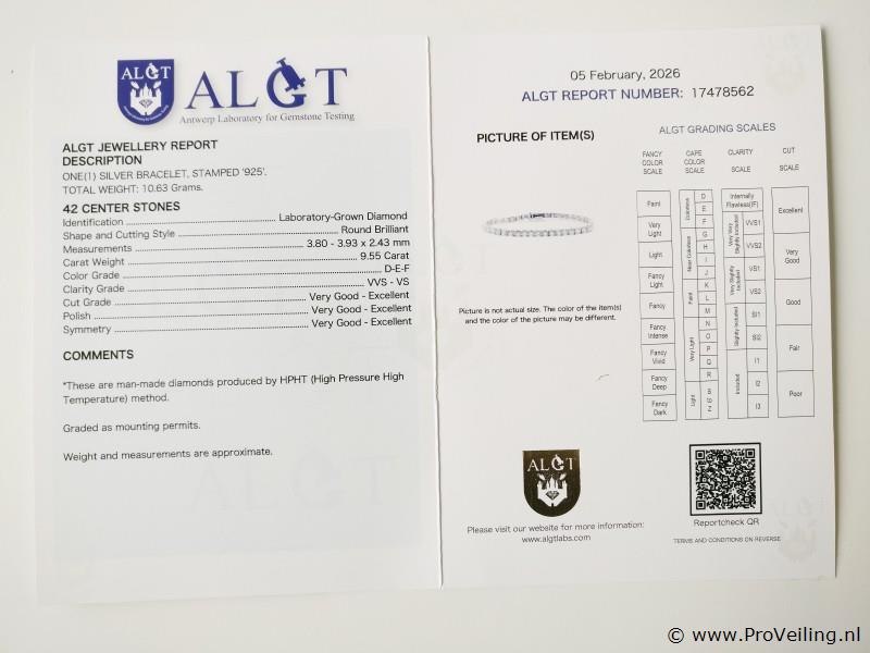 ALGT Report Number 17478562 Metal: 925 Silver Weight: 10.63 grams Measurements: 180x4x3mm Center Stone: Lab Grown Diamond 9.55 ct D-F VVS-VS Shipping: Free insured shipping within the EU with track and trace Additional information: Some of the images are zoomed in. Please refer to the measurements for actual size Packaging: Comes with a jewelry box