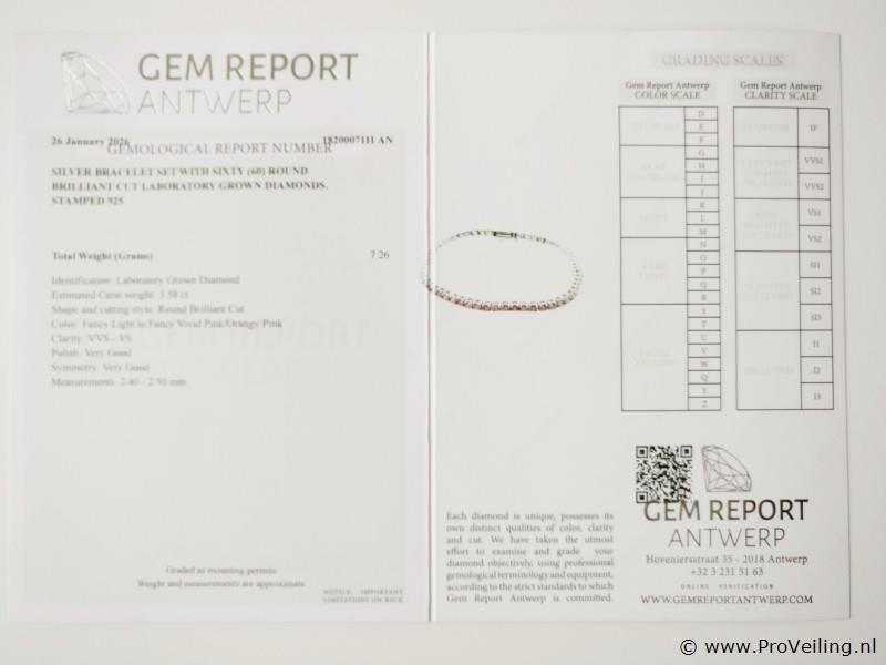 GRA Report Number 1820007111AN Metal: 925 Silver Weight: 7.26 grams Measurements: 173x2x3mm Center Stone: Lab Grown Diamond 3.58 ct Fancy Light to Fancy Vivid Pink/Orangy Pink VVS-VS Shipping: Free insured shipping within the EU with track and trace Additional information: Some of the images are zoomed in. Please refer to the measurements for actual size Packaging: Comes with a jewelry box