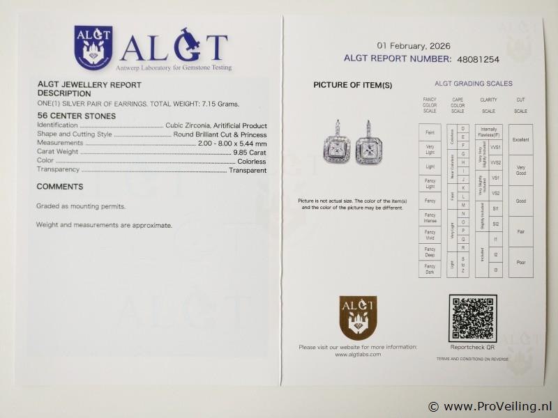 ALGT Report Number 48081254 Metal: Silver Weight: 7.15 grams Measurements: 25x16x7mm Center Stone: Cubic Zirconia 9.85 ct Colorless Transparent Shipping: Free insured shipping within the EU with track and trace Additional information: Some of the images are zoomed in. Please refer to the measurements for actual size Packaging: Comes with a jewelry box