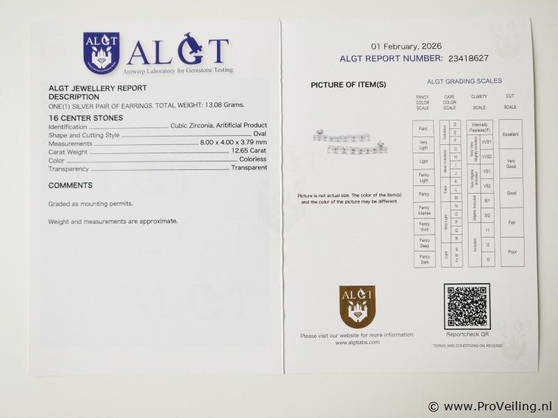 ALGT Report Number 23418627 Metal: Silver Weight: 13.08 grams Measurements: 55x6x16mm Center Stone: Cubic Zirconia 12.65 ct Colorless Transparent Shipping: Free insured shipping within the EU with track and trace Additional information: Some of the images are zoomed in. Please refer to the measurements for actual size Packaging: Comes with a jewelry box
