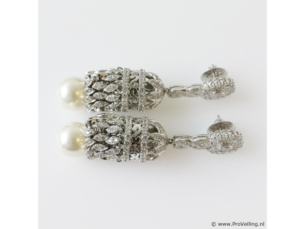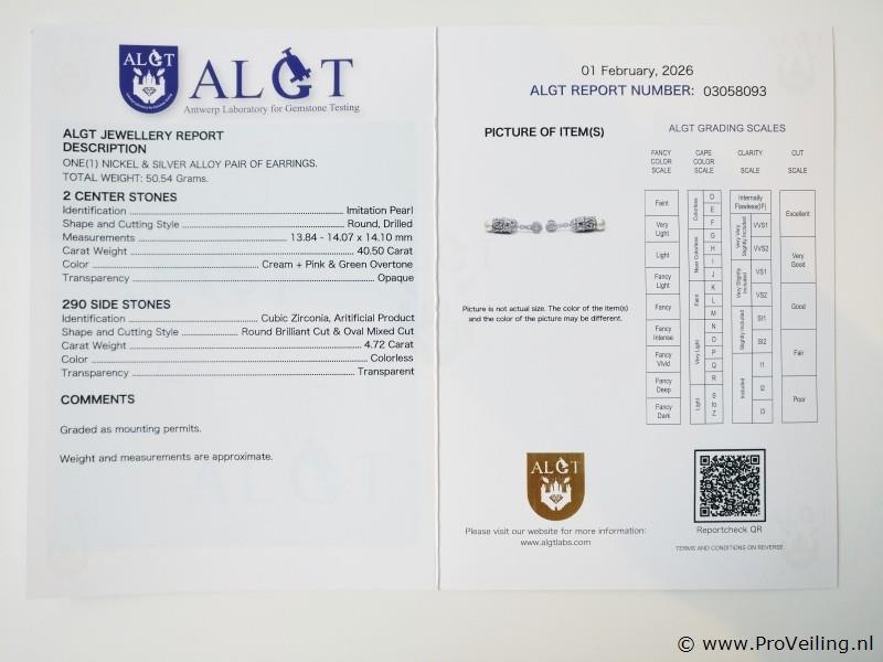 ALGT Report Number 03058093 Metal: Silver & Nickel Alloy Weight: 50.54 grams Measurements: 70x16x15mm Center Stone: Imitation Pearl 40.50 ct Cream + Pink & Green Overtone Opaque Side Stones: Cubic Zirconia 4.72 ct Colorless Transparent Shipping: Free insured shipping within the EU with track and trace Additional information: Some of the images are zoomed in. Please refer to the measurements for actual size Packaging: Comes with a jewelry box