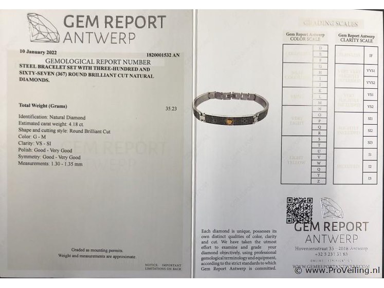 4.18ct Men's Bracelet GRA Report Number 1820001532AN Metal: Stainless Steel Weight: 35.23 grams Measurements: 200x9x2.5 mm Center Stone: Natural Diamond 4.18 ct G-M VS-SI Shipping: Free insured shipping within the EU with track and trace Additional information: Some of the images are zoomed in. Please refer to the measurements for actual size Packaging: Comes with a jewelry box