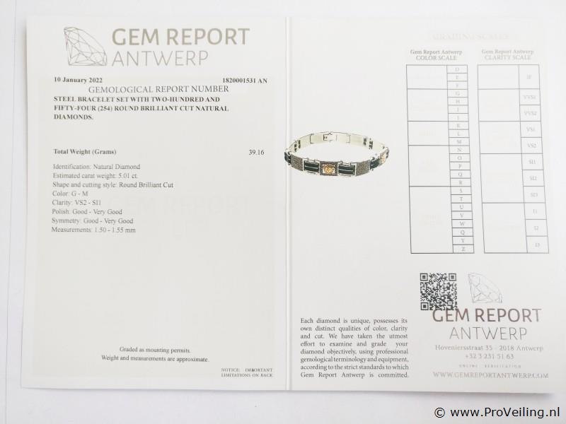 5.01ct Men's Bracelet GRA Report Number 1820001531AN Metal: Stainless Steel Weight: 39.16 grams Measurements: 214x11x2 mm Center Stone: Natural Diamond 5.01 ct G-M VS2-SI1 Shipping: Free insured shipping within the EU with track and trace Additional information: Some of the images are zoomed in. Please refer to the measurements for actual size Packaging: Comes with a jewelry box