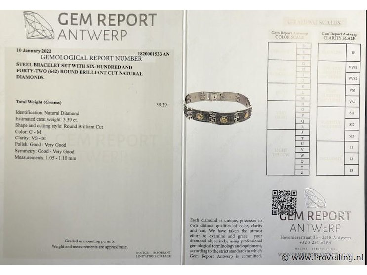 5.59ct Men's Bracelet GRA Report Number 1820001533AN Metal: Stainless Steel Weight: 39.29 grams Measurements: 206x12x2 mm Center Stone: Natural Diamond 5.59 ct G-M VS-SI Shipping: Free insured shipping within the EU with track and trace Additional information: Some of the images are zoomed in. Please refer to the measurements for actual size Packaging: Comes with a jewelry box