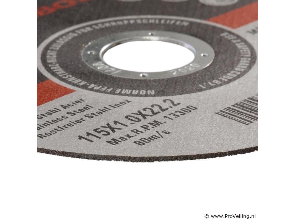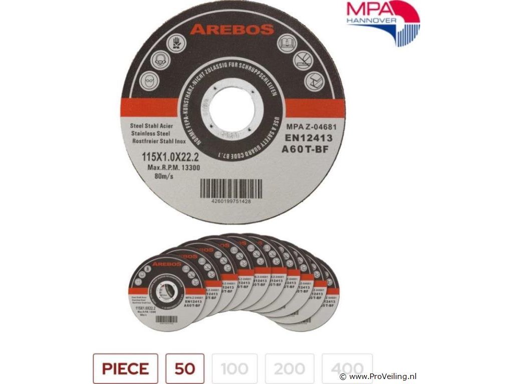 [Compatibiliteit] De AREBOS - doorslijpschijven zijn compatibel met alle gangbare modellen haakse slijpers. Met een schijfdiameter van 115 mm, een boringmaat van 22,2 mm en een dikte van 1mm zijn deze doorslijpschijven geschikt voor een groot aantal toepassingen. [Industriële kwaliteit] De hoogwaardige afwerking is direct merkbaar dankzij gelijkmatig verdeelde slijpkorrels en versterkt veiligheidsgaas. Materialen als ijzer, plaatstaal, metaal, staal en roestvrij staal kunnen probleemloos worden bewerkt. [Schoon en nauwkeurig] Doordat u kunt kiezen tussen voorwaartse en achterwaartse richting, kunt u flexibel een keuze maken op basis van de eisen van uw specifieke project. Ondanks de manier waarop droog doorslijpen werkt, wordt er bij het werken met de AREBOS-doorslijpschijven zeer weinig stof gegenereerd en het is bovendien zeer nauwkeurig. [Hoogste kwaliteits- en veiligheidsnormen] Onze doorslijpschijven voldoen aan de veiligheidsnormen van EN 12413 (de Europese norm 12413). Dit is getest en bevestigd door het materiaaltestinstituut van Hannover (MPA Hannover). [Robuust en veerkrachtig] Dankzij het hoogwaardige staalgaas zijn de doorslijpschijven van AREBOS extreem veerkrachtig, robuust en duurzaam. Met 13300 tpm en 80 m/s kunt u uw klusjes in huis in zeer korte tijd uitvoeren. Waarschijnlijk heeft elke klusser die met metaal werkt wel eens met doorslijpschijven gewerkt. Dankzij hun veelzijdige gebruik kunnen de schijven worden gebruikt voor het bewerken van een breed scala aan materialen. Ze kenmerken zich door een zuivere, nauwkeurige en soepele doorslijpmethode en zijn daarom een 'welkome helpende hand' bij het in- en doorslijpen van dunwandige buizen, balken, dunne metaalplaten en carrosserieplaten. De AREBOS-doorslijpschijven overtuigen door een goed slijpvermogen en een zeer lange levensduur. Daarnaast is er slechts zeer minimaal sprake van braamvorming. Zuiver slijpen en werken tot op de millimeter nauwkeurig is geen probleem met de doorslijpschijven van AREBOS. Onze doorslijpschijven voldoen aan de veiligheidsnormen van EN 12413 (de Europese norm 12413). Dit is getest en bevestigd door het materiaaltestinstituut van Hannover (MPA Hannover). Onze doorslijpschijven zijn geschikt voor alle gangbare haakse slijpers. Ze zijn van industriële kwaliteit en daarom een must voor uw werkplaats. Overtuig uzelf en ontdek de premium kwaliteit en afwerking van AREBOS-producten!