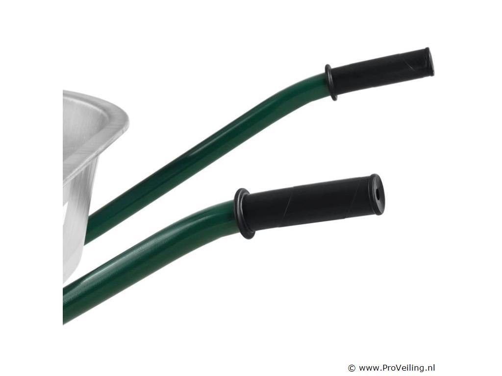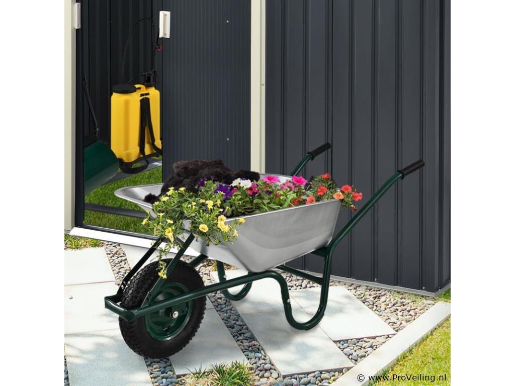De veelzijdige tuinkruiwagen met gegalvaniseerde kuip en luchtbanden is een onmisbare transporthulp. Het is ideaal voor het gemakkelijk verwijderen van stortgoed in de tuin, stal of op de bouwplaats. Met zijn 100 liter kuip biedt hij voldoende ruimte voor allerlei soorten bulkgoederen: of het nu gaat om het snoeien van heggen, het planten van groenten, het leggen van tegels of het opruimen van de stal - de eenwielerwagen maakt stal-, renovatie- en tuinwerk gemakkelijker voor u. Technische specificaties: Materiaal bak: verzinkt plaatstaal, 0,7 mm dik Materiaal frame: staalbuis, 1,2 mm dik Materiaal handgrepen: kunststof Volume: 100L Leeg gewicht: 12,4 kg Maximale belasting: 210 kg Werkdruk banden: 2 bar Kleuren: zilver, donkergroen, zwart Afmetingen (ongeveer): Breedte: 59cm Lengte: 141cm Hoogte: 62cm Wiel: Ø 40 cm Leveringsomvang: 1 x kruiwagen 1 x instructie