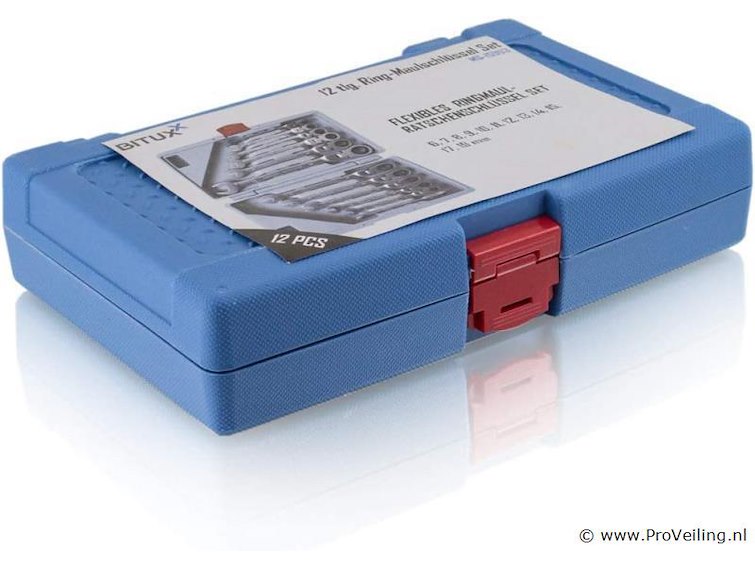 De set bestaat uit 12 ratelsleutels met scharnierkoppen, waarmee je ook op moeilijk bereikbare plaatsen kunt werken. De gereedschappen zijn gemaakt van robuust en duurzaam chroom-vanadiumstaal Ratelsleutels: 6 mm, 7 mm, 8 mm, 9 mm, 10 mm, 11 mm, 12 mm, 13 mm, 14 mm, 15 mm, 17 mm, 19 mm (5 graden terughaalhoek / 72 tanden) Praktisch en overzichtelijk, veilig opgeborgen in de kunststof koffer Technische specificaties: Maten: 6 mm, 7 mm, 8 mm, 9 mm, 10 mm, 11 mm, 12 mm, 13 mm, 14 mm, 15 mm, 17 mm, 19 mm Aantal tanden: 72 Resethoek: 5 graden Materiaal kast: kunststof Gereedschapsmateriaal: chroom-vanadiumstaal Leveringsomvang: 1x ratelsleutel met scharnier: 6 mm, 7 mm, 8 mm, 9 mm, 10 mm, 11 mm, 12 mm, 13 mm, 14 mm, 15 mm, 17 mm, 19 mm