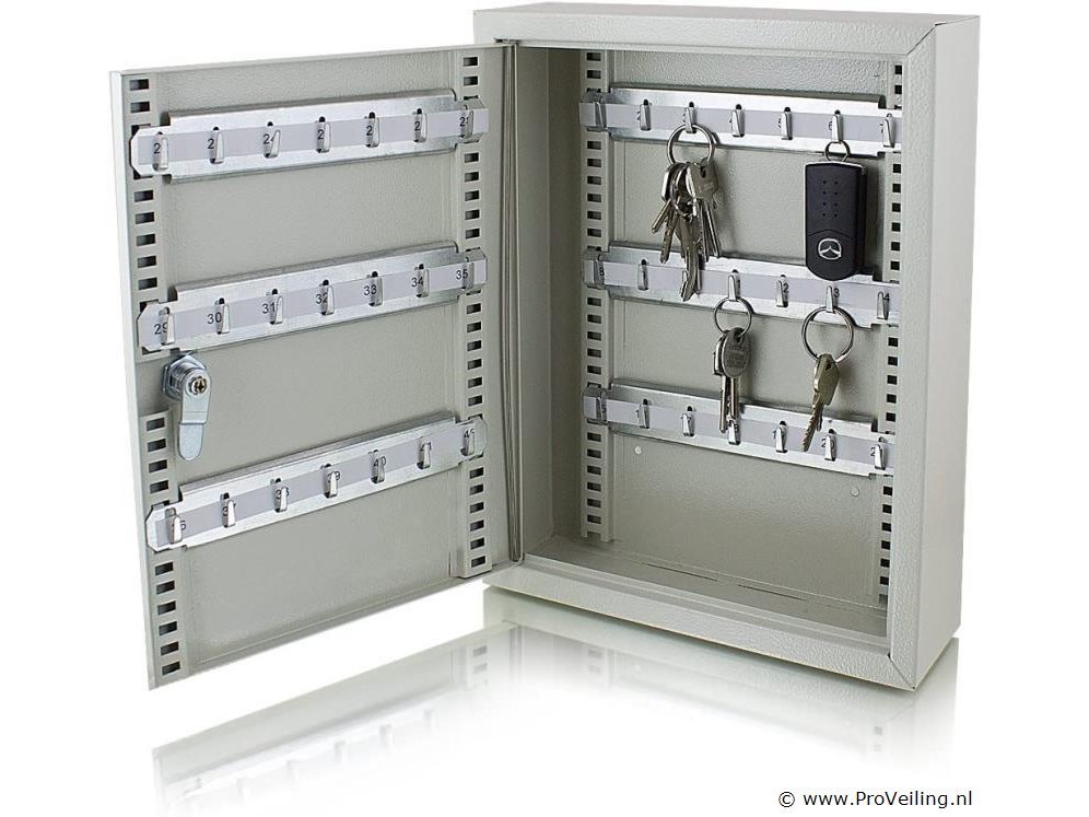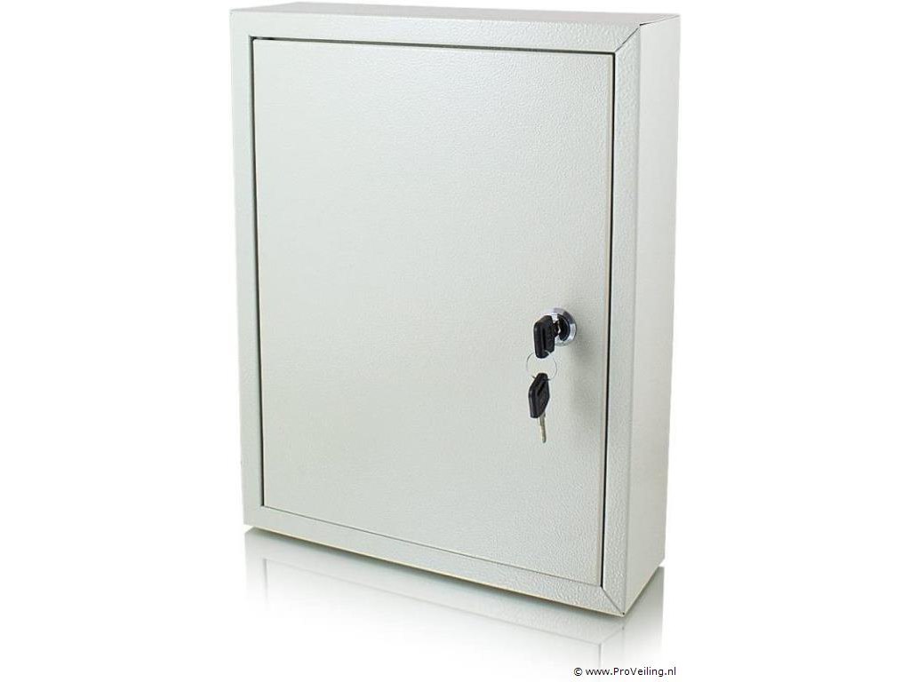 Beschrijving: De sleutelkluis is ideaal voor het opbergen van belangrijke sleutels. Kies tussen veilige wand- of kastmontage. De sleutelkluis wordt geopend met de meegeleverde veiligheidssleutel. Inrichting: Sleutelkluis voor wand- of kastmontage 6x flexibele rijen sleutels, elk met 7 haken Inclusief 2 beveiligingssleutels Technische specificaties: Afmetingen: 270 mm x 350 mm x 80 mm (B/H/D) Stalen wanddikte: 1 mm Stalen deurdikte: 2 mm Kleur: lichtgrijs Gewicht: 2,10 kg Leveringsomvang: 1x sleutelkluis met insteeksysteem 2x beveiligingssleutels 4x pluggen 4x schroeven 6x steeksleutelrijen