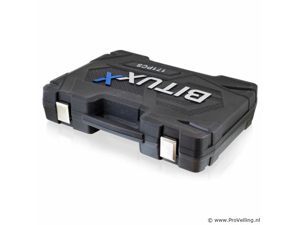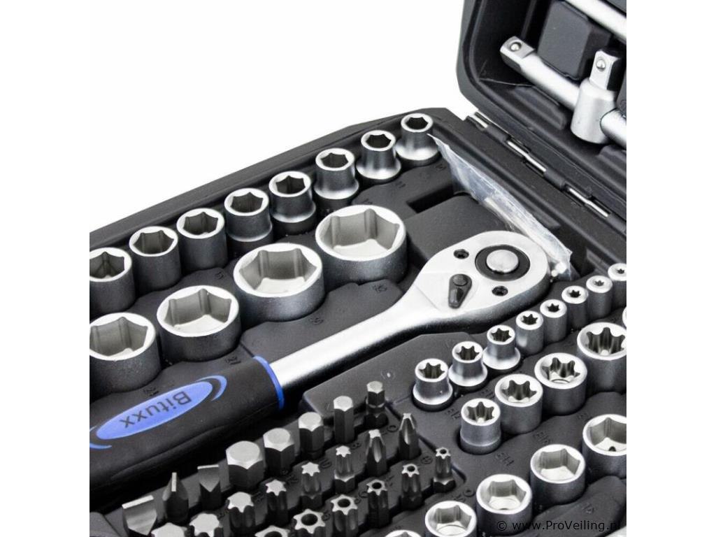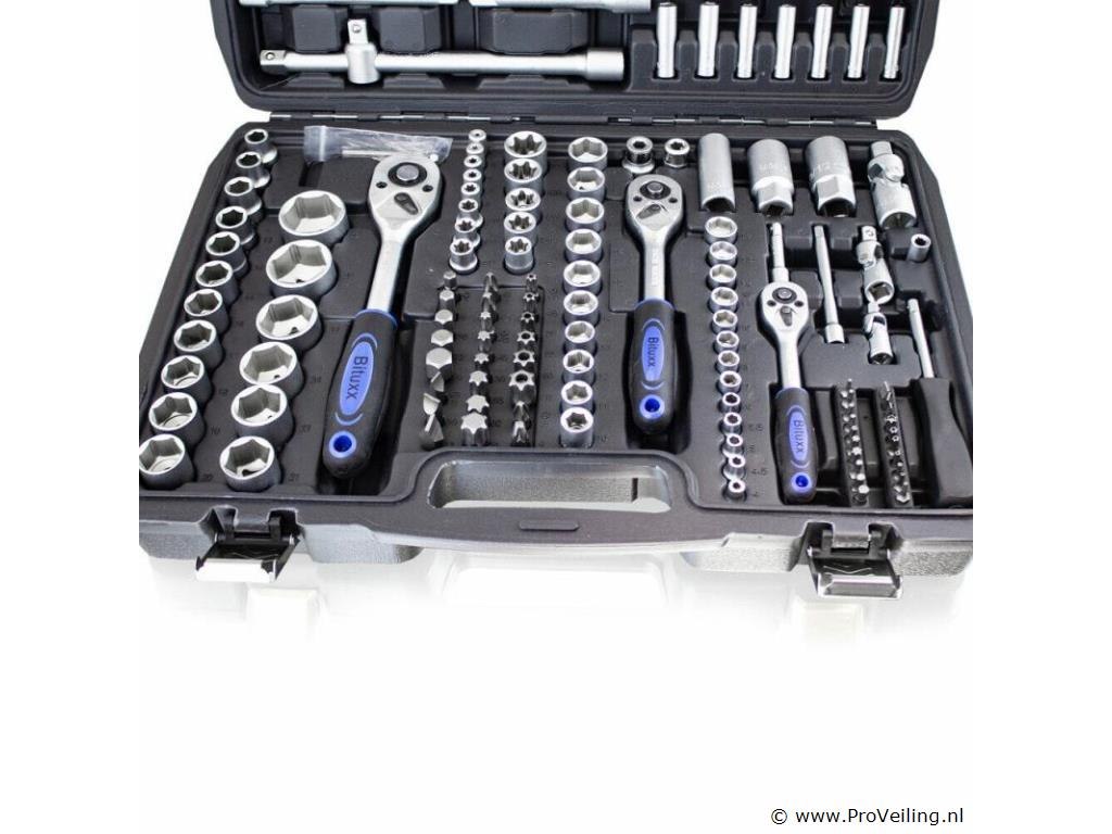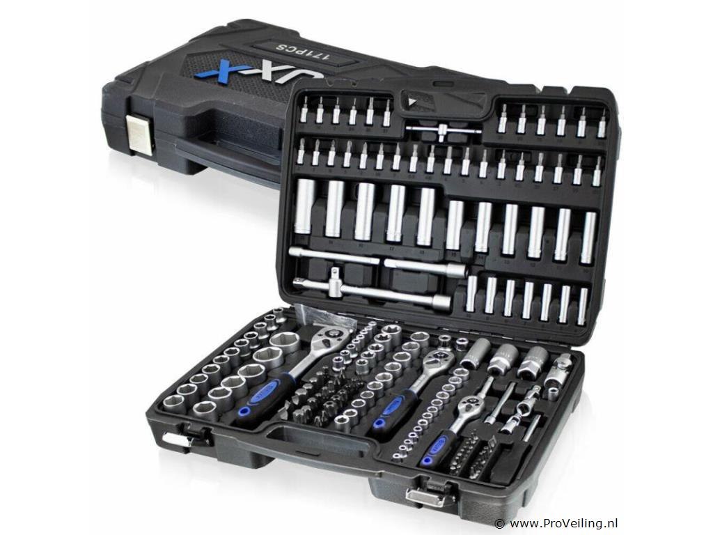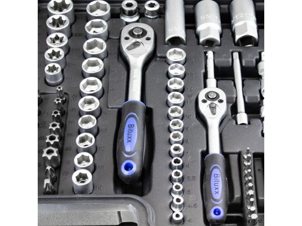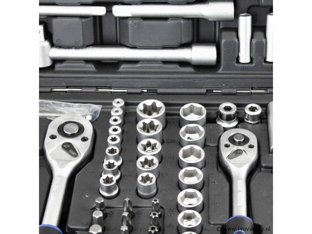 Deze 171-delige gereedschapskofferset met ratel overtuigt door kwaliteit en omvang. De ideale set voor de ambitieuze doe-het-zelver, praktisch en overzichtelijk, veilig opgeborgen in de koffer. Het gereedschap is gemaakt van chroom-vanadium-staal, het vanadium zorgt voor een verhoogde taaiheid met een fijnere structuur en het chroomgehalte verbetert de corrosiebescherming en hardbaarheid. Technische specificaties: Materiaal kast: kunststof Gewicht (N/G) ca. 9,2 kg Gereedschapsmateriaal: chroom-vanadiumstaal Leveringsomvang: 1/2" 17x 1/2" doppen: 10, 11, 12, 13, 14, 15, 16, 17, 18, 19, 20, 21, 22, 24, 27, 30, 32 mm 5x 1/2" extra diepe doppen: 16, 17, 18, 19, 22 mm 2x 1/2" Torx doppen: E20, E24 2x 1/2" bougiedoppen: 16 mm & 21 mm 2x 1/2" verlengstukken: 5" & 10" 1/4" 30x 1/4" bitdoppen: H2, 3, 4, 5, 6 FD4, 5. 5.5, 7 PH1, 2, 3 T8, 9, 10, 15, 20, 25, 27, 30, TT8, 9, 10 , 15, 20, 25, 27, 30 13x 1/4" doppen: 4, 4,5, 5, 5,5, 6, 7, 8, 9, 10, 11, 12, 13, 14 mm 7x 1/4" extra diepe doppen: 4, 5, 6, 7, 8, 9, 10 mm 5x 1/4" Torx doppen: E4, E5, E6, E7, E8 2x 1/4" verlengstukken: 2" & 4" 1x 1/4" T-greep 1x 1/4" steekgreep: 6" 3/8" 10x 3/8" doppen: 10, 11, 12, 13, 14, 15, 16, 17, 18, 19 mm 6x 3/8" Torx doppen: E10, E11, E12, E14, E16, E18 6x 3/8" extra diepe doppen: 10, 11, 12, 13, 14, 15 mm 1x 3/8" bougiedop: 21 mm 1x 3/8" verlengstuk: 6" ratels 3x ratel: 1/4", 3/8" & 1/2" 3x cardangewrichten: 1/4", 3/8" & 1/2" 2x aansluitingen (8 mm): 3/8" & 1/2" 1x driedubbele adapter Bits: 24x bits: H7, 8, 10, 12, 14 FD8, 10, 12 PH3, 4 PZ3, 4e T40 45, 50, 55, 60, 70 TT40, 45, 50, 55, 60, 70 10x bits: T3, 4, 5, 8, 9, 10, 15, 20, 25, 30 10x bits: TT4, 5.5, 7, 8, 9, 10, 15, 20, 25, 30 inbussleutel 7x inbussleutels: 1,5, 2, 2,5, 3, 4, 5, 6 mm Overig: 1x kunststof koffer