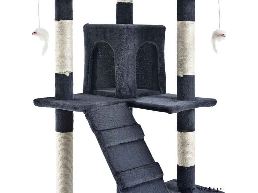 De halfhoge krabpaal Amy (grijs) laat kattenharten sneller kloppen. Het biedt uw geliefde huisdier tal van mogelijkheden om te spelen, rond te springen, te rusten en hun klauwen te scherpen. Uw kat zal zich helemaal op zijn gemak voelen en zich graag terugtrekken in de krabpaal. Door zijn compacte ontwerp neemt de 170 cm hoge krabpaal weinig ruimte in beslag en is zelfs in kleine appartementen te vinden. Dit maakt deze krabpaal tot een waardevolle investering voor iedere kattenbezitter. Technische specificaties: Materiaal: MDF hout, pluche, sisal Kleur grijs Diameter kolommen: 7 cm Aantal ligplaatsen: 3 Aantal grotten: 2 Aantal ladders: 2 Aantal muizen: 3 Afmetingen (ongeveer): Totale hoogte: 170 cm Bodemplaat: 49 x 49 cm Grot groot: 50 x 24 x 25 cm Grot klein: 24 x 24 x 27 cm Diameter ligvlak: 25 cm Leveringsomvang: 1 x krabpaal 1 x Instructie
