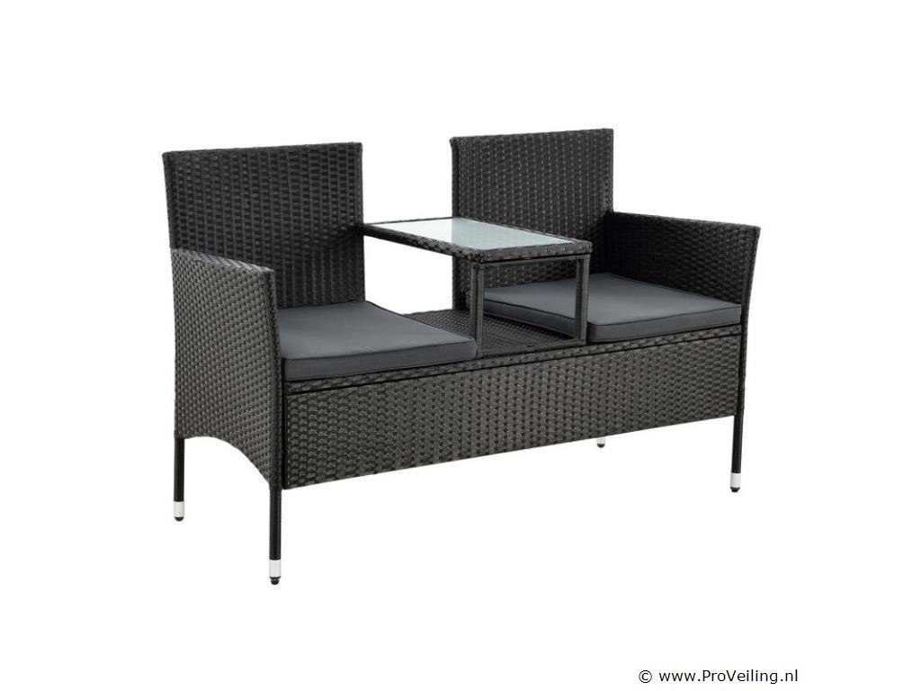 Bent u op zoek naar een stijlvolle zitgelegenheid voor uw balkon, tuin of terras die comfortabel en ruimtebesparend is? Kies dan voor de moderne polyrotan bank Monaco in zwart met donkergrijze zitkussens. De kleine tuinbank voor 2 personen neemt buiten maar weinig ruimte in beslag (133 × 63 × 84 cm) en is daarom ideaal als balkonmeubel. Ook bij de vijver, het zwembad of onder een boom oogt de 2-zitsbank in rotan-look modern en tijdloos. Het trendy vlechtwerk van polyrattan is onderhoudsvriendelijk en zorgt samen met het dikke zitkussen voor een zachte zitervaring. Zet drankjes of snacks op het kleine tafeltje in het midden. Technische specificaties: Materiaal gaas: polyrotan Materiaal frame: staal Materiaal tafelblad: glas Materiaal bekleding: schuim Materiaal hoezen: polyester Vlechtkleur: zwart Kleur kussensloop: donkergrijs Aantal zitplaatsen: 2 Hoezen wasbaar: ja Weerbestendig: ja Afmetingen (ongeveer): Totale afmetingen (BxDxH): 133 × 63 × 84 cm Zitkussen: 5 cm hoog Hoogte van de glasplaat: 0,5 cm Leveringsomvang: 1 x poly rotan bank 1 x geïntegreerde tafel 2 x zitkussens 1 x Instructie De poly rattan zitgroep wordt geleverd als bouwpakket voor zelfmontage per pakketdienst.