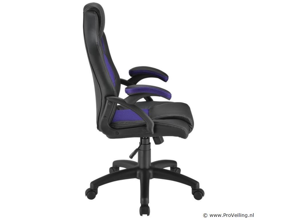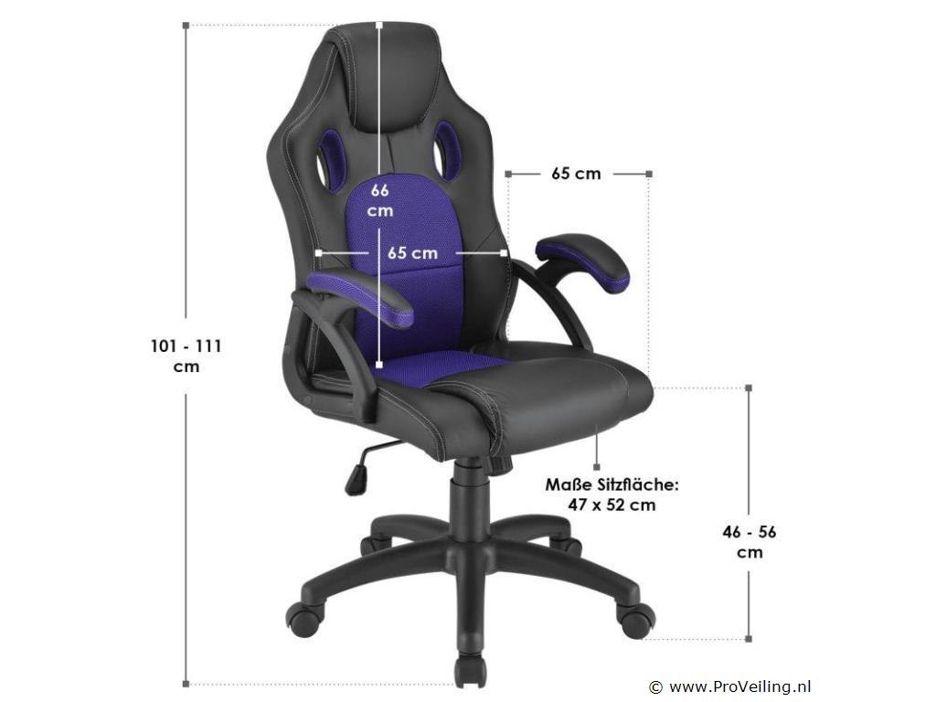 De gezellige Racing bureaustoel Montreal (paars) overtuigt met een hoog zitcomfort. Met zijn ergonomisch gevormde zitting, de kantelbare rugleuning en zitting en de gecapitonneerde armleuningen laat de moderne bureaustoel in trendy racer design urenlang comfortabel zitten. De draaistoel is daarom ideaal om thuis op kantoor te werken, huiswerk te maken en te leren, en voor gepassioneerde gamers om op de computer te spelen. Technische specificaties: Materiaal: kunststof, metaal, imitatieleer, mesh inzetstuk Kunstleer kleur: Zwart Mesh kleur: paars Maximale belasting: 120 kg Afmetingen (ongeveer): Totale hoogte: 101 - 111 cm Hoogte rugleuning: 65 × 66 cm Zitting: 47 x 52 cm Zithoogte: 46 - 56 cm Zitbreedte: 47 cm Zitdiepte: 52 cm Leveringsomvang: 1 × bureaustoel 1 × montage-instructies