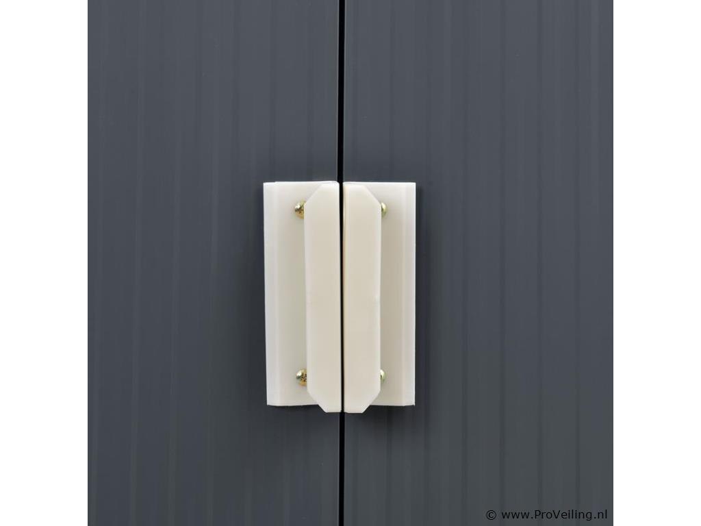 Creëer orde in je tuin - met de moderne XL metalen gereedschapsschuur met schuin dak. Maak een einde aan roestig tuingereedschap of lelijke geïmproviseerde hoezen. Tuinmeubelen, tuingereedschap en fietsen vinden een beschutte plek in de ruime gereedschapsschuur. Zo berg je je outdoor spullen droog, schoon en netjes op. Een onderstel van metaal en een praktische dubbele schuifdeur maken de uitrusting compleet. Nog een pluspunt: ventilatieroosters zorgen voor een goede luchtcirculatie. Technische specificaties: Materiaal tuinhuisje: plaatstaal, kunststof Materiaal fundering: metalen frame Kleur antraciet Bergruimte: ca. 9 m³ Afmetingen (ongeveer): Totale afmetingen: 277 × 191 × 192 cm Interne afmetingen: 267 × 181 × 187 cm Afmetingen voet: 267 × 181 cm Nokhoogte: 192 cm Hoogte dakrand: 152 cm Deur: 96 x 152 cm Leveringsomvang: 1 x metalen gereedschapsschuur 1 x funderingsframe 1 x montage-instructies Dit artikel bestaat uit 3 dozen, het kan logistiek voorkomen dat het in meerdere dagen geleverd wordt.