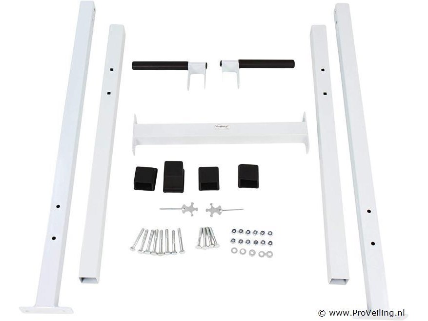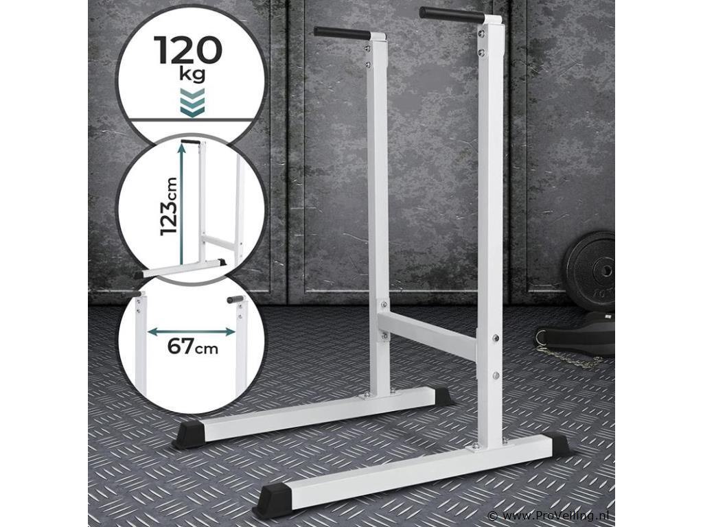 Kom in vorm met deze dipstandaard. Biceps, triceps, rug en buikspieren - uw spieren groeien met het dipstation van wit gelakt metaal en regelmatige training. Trek jezelf omhoog aan de metalen staven met gewatteerde handgrepen, herhaal dit keer op keer en voeg toe aan je dagelijkse routine. Het dipperstation is zeer robuust, aangezien het belastbaar is tot maximaal ca. 120 kg. Dip stand helpt bij body steeling geverfd metaal met gevoerde handgrepen ideaal voor professionals en beginners voor biceps-, triceps-, buik- en rugtraining Technische specificaties Afmetingen (L/B/H): ca. 98/65/125 cm Gewicht: ca. 11,5 kg max. belasting: ca. 120 kg Materiaal: gelakt metaal Kleur: wit, zwart Leveringsomvang: 1 x dipstandaard BHTN12 als bouwpakket voor zelfmontage 1 x meertalige montagehandleiding (DE/EN/FR)