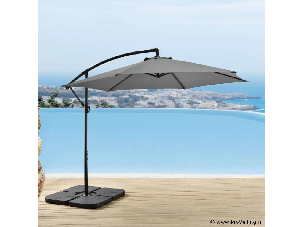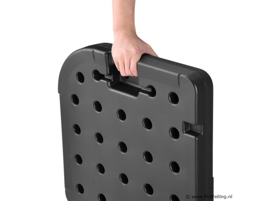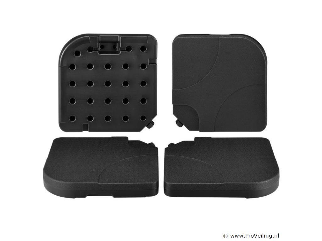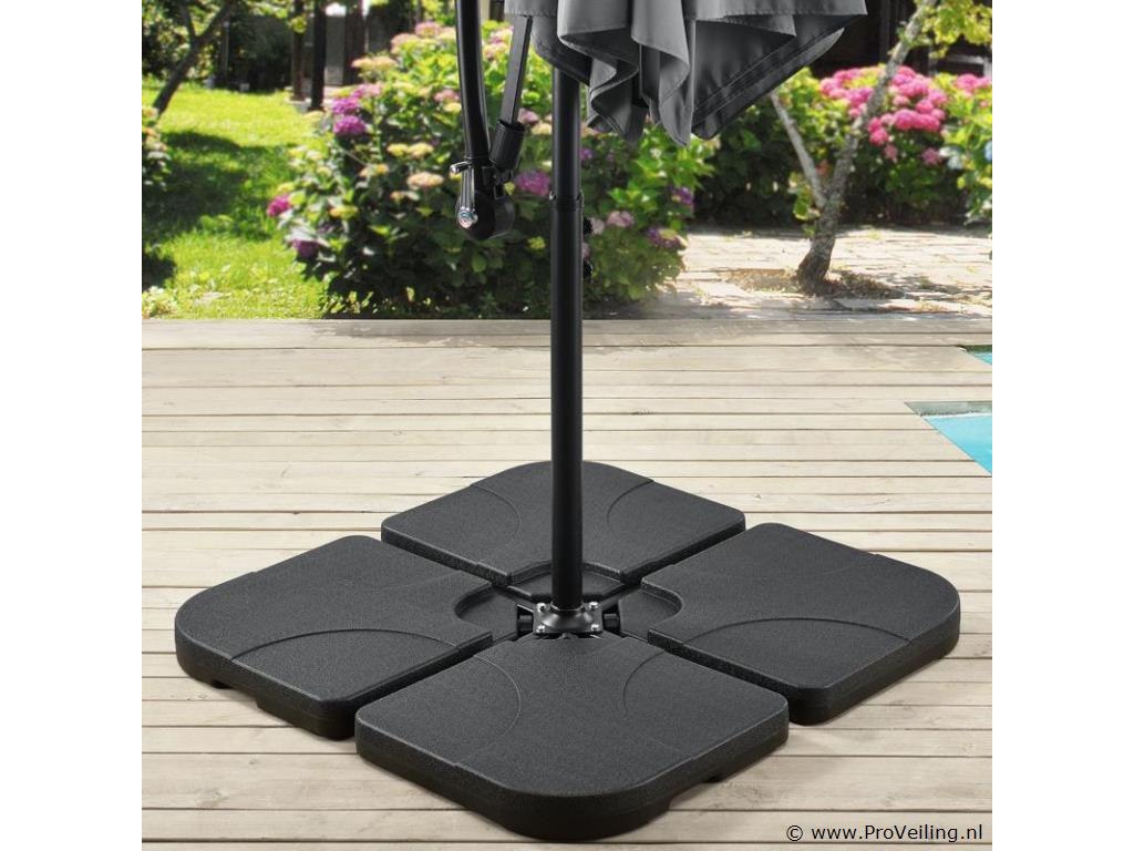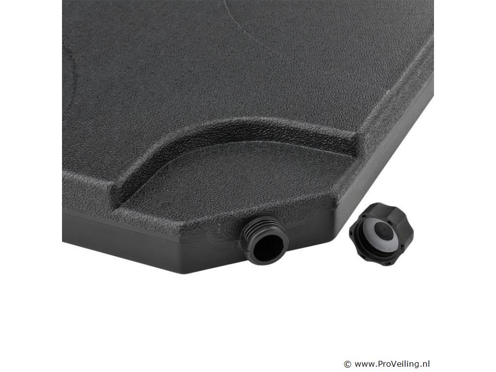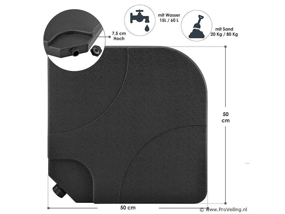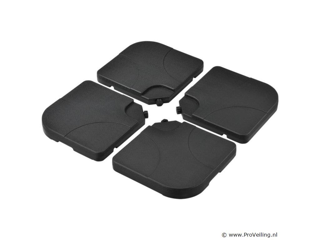 De praktische parasolgewichtset van 4 Quad (zwart) van kunststof is de perfecte aanvulling op parasolstandaarden met een kruisvoet. De met zand en water te vullen gewichten zorgen ervoor dat uw parasol / vrijdragende parasol niet per ongeluk omvalt. Uw rustgevende schaduwaanbieder staat stevig op de grond. Op het balkon of terras kun je het helemaal naar je zin hebben en in de schaduw genieten van het mooie weer. Technische specificaties: Materiaal: HDPE-kunststof De kleur zwart Aantal gewichten: 4 Kan worden gevuld met: water / zand Capaciteit per gewicht: 15 liter / 20 kg Totale inhoud: 60 liter / 80 kg Afmetingen (ongeveer): Totale afmetingen: 100 × 100 × 7,5 cm Afmeting per parasolgewicht: 50 × 50 × 7,5 cm Leveringsomvang: 4 × parasolgewicht 1 × Instructie