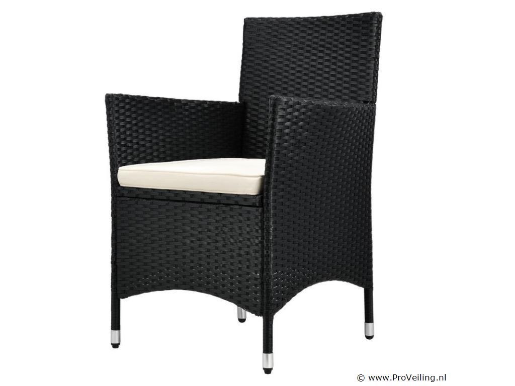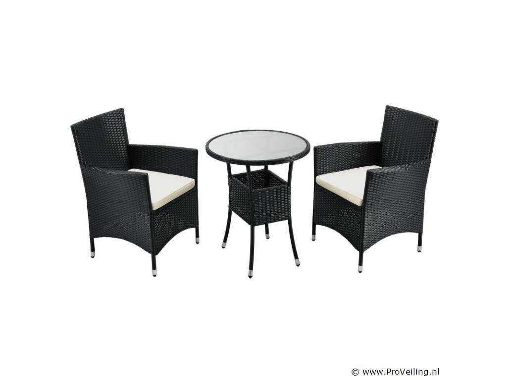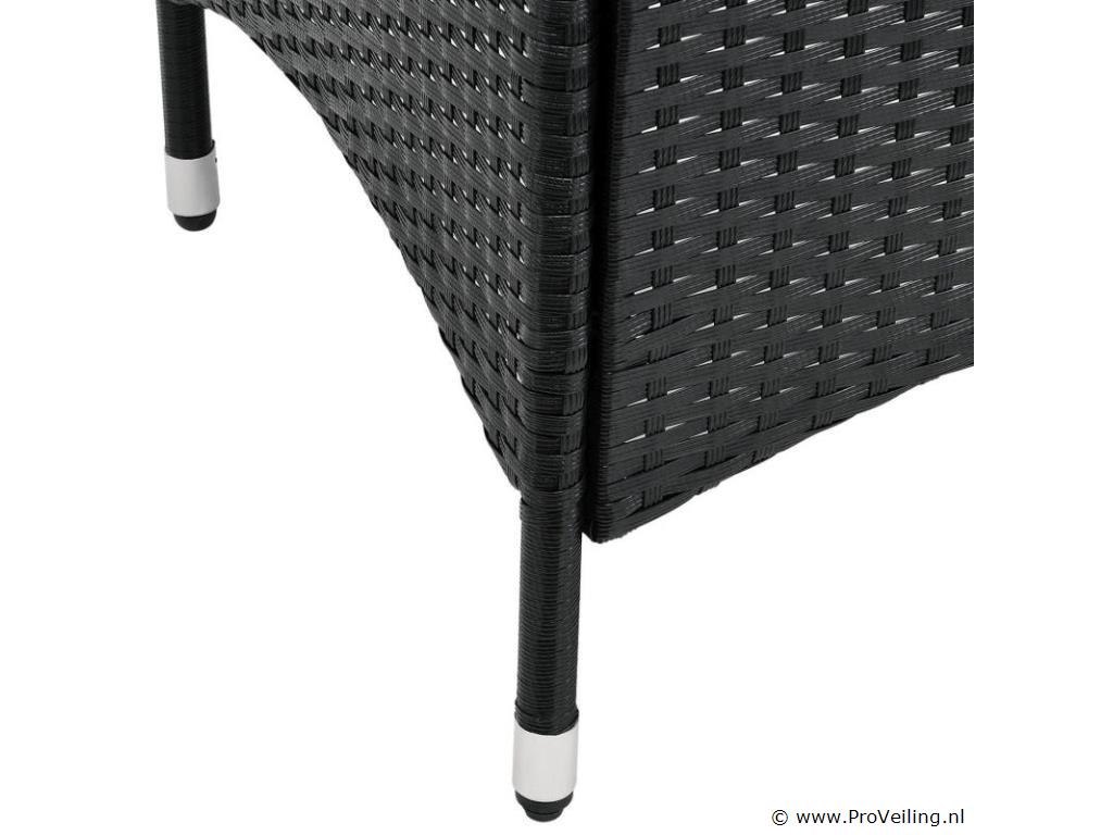 Technische specificaties: Materiaal stoel: polyrotan & metaal Materiaal tafel: polyrotan, metaal & glas Materiaal pads: polyester & schuim Wasbare hoezen: ja Weerbestendig: ja Kleur meubel: zwart Kleur zitkussens: crème Maximaal gewicht: 160 kg Afmetingen (ongeveer): Afmetingen stoel: 58 x 58 x 85 cm (lengte x breedte x hoogte) Stoelzitting: 45 x 45 cm Zithoogte: 41 cm Hoogte tafel: 73 cm Diameter tafel: 60 cm