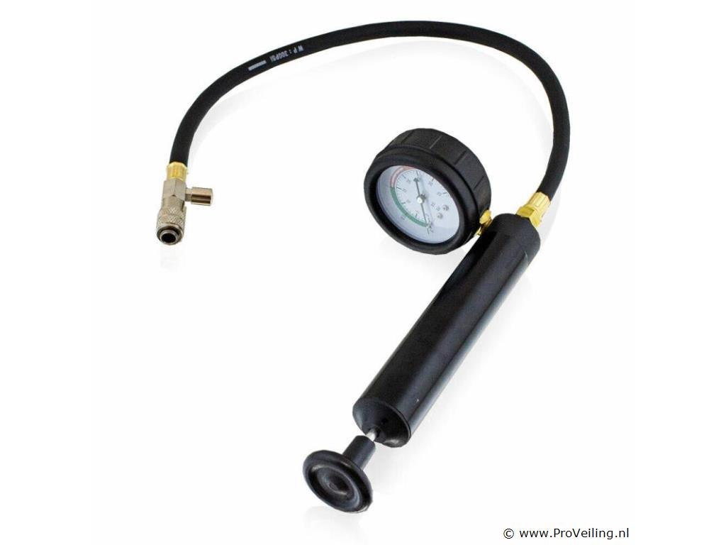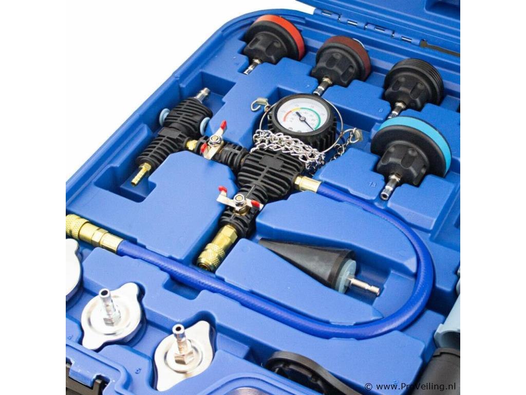 Uitgebreid 28-delig koelsysteem, test- en vulsysteem in praktische koffer De lekdetector voor het koelsysteem is geschikt voor alle gangbare automodellen en merken uit Europa, Azië en de VS Controleer en test snel het koelsysteem van uw voertuig met deze lekdetector voor het koelsysteem. Eenvoudige en ongecompliceerde testset voor het koelsysteem bestaande uit een manometer met pomp, vuleenheid en verschillende adapters voor de voertuigmodellen Ideaal voor werkplaatsen en hobbyisten leveringsomvang 1x pomp met manometer 1x vuleenheid 1x temperatuursensor 0-200° 1x slang 1x adaptersleutel 23x adapters 1x kunststof koffer Technische specificaties Afmetingen kast: 580 mm x 480 mm x 110 mm (L/B/H) maximale druk: 0 - 2,5 bar Gewicht: 5,5 kg