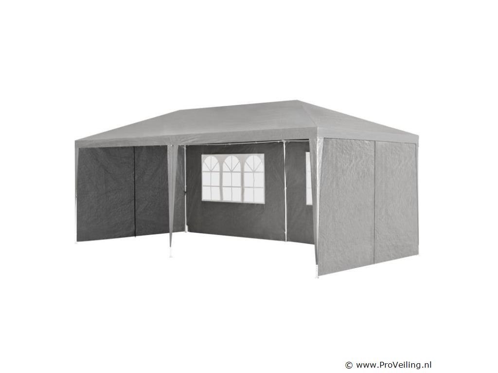 De partytent van 3 x 6 m (grijs) is de perfecte zonwering voor alle soorten buitenevenementen Of het nu gaat om een ??barbecue, een verjaardag of een bruiloft - het praktische paviljoen nodigt uit om samen te zitten en feest te vieren met familie en vrienden. Onder de feesttent zijn u en uw gasten goed beschermd tegen de brandende zon. 's Avonds dienen de uitneembare zijpanelen als extra bescherming tegen koele tocht en muggen. Optimale voorwaarden om speciale gelegenheden uitgebreid te vieren in eigen tuin of op het terras. Technische specificaties: Materiaal frame: staal, gepoedercoat (100%) Materiaal dak: 100 g/m² polyethyleen (100%) Materiaal zijdelen: 90 g/m² polyethyleen (100%) Kleur tuintent: grijs Zijwand met raam: 4 Zijpaneel met ritssluiting: 2 Aantal voeten: 6 Aantal bevestigingstouwen: 6 Aantal grondpennen: 12 Afmetingen (ongeveer): Breedte: 300cm Diepte: 600 cm Hoogte: 250cm Paaldak: Ø 1,8 cm Plaatbodem: Ø 2,4 cm Leveringsomvang: 1 × feesttent 1 × montage-instructies tips: LET OP: Het tuinpaviljoen biedt onvoldoende bescherming bij storm of slecht weer. Niet gebruiken tijdens onweer, sterke windstoten, zware regenval of hagel. Het paviljoen is niet ontworpen voor dit weertype. Alleen geschikt voor privégebruik. Zet de partytent veilig op een vlakke, droge en stevige ondergrond. Houd de minimale afstand van 3 m tot de volgende tent aan. Het is niet mogelijk om 2 tenten aan elkaar te koppelen.