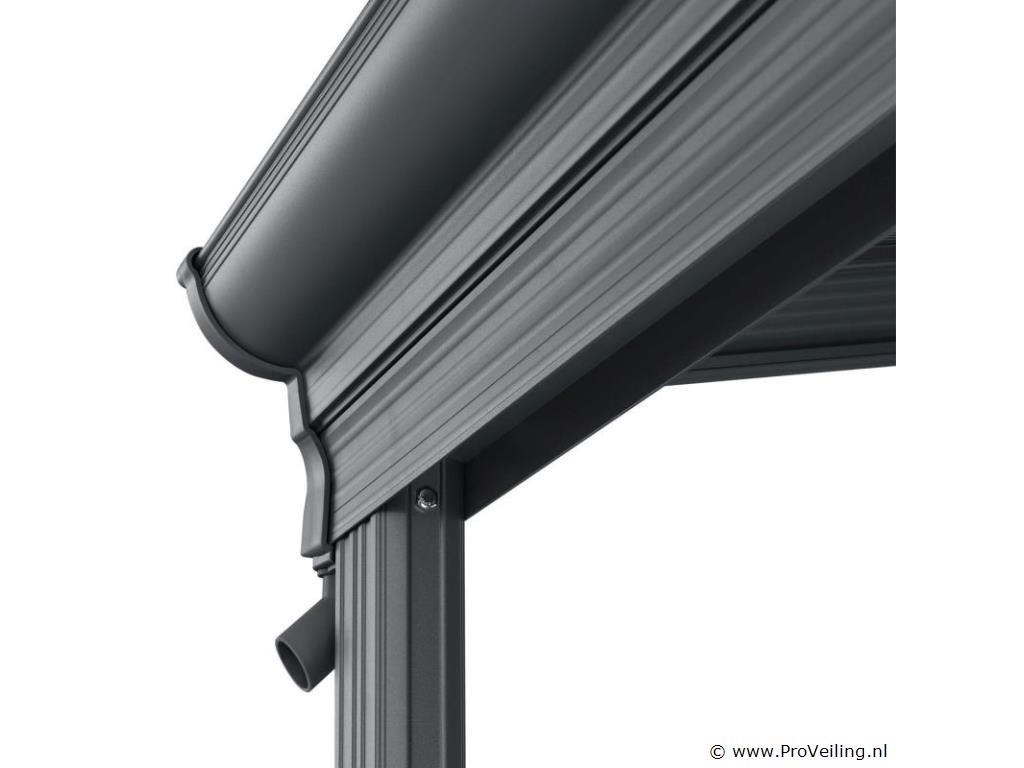 Bent u op zoek naar een moderne, stabiele en hoogwaardige zonwering? De aluminium terrasoverkapping van 3 x 3 m Borneo (antraciet) is de perfecte overkapping voor uw terras. Door de robuuste metalen constructie en de elegante uitstraling dient het dak jarenlang als stijlvolle zonwering. Of het nu gaat om de felle zon of een regenbui - de terrasoverkapping biedt u bescherming tegen regen en schadelijke UV-straling. Zo breng je je vrije tijd altijd ontspannen buiten door. Want met de betrouwbare overkapping ben je goed beschermd! Tegelijkertijd beschermt het ook je geliefde tuinmeubelen tegen weersinvloeden. Technische specificaties: Materiaal frame: aluminium gepoedercoat Materiaal aansluitingen: verzinkt staal Materiaal dak: polycarbonaat met UV-coating Kleur frame & webplaten: donkergrijs Aantal berichten: 2 Aantal regengoten: 1 Aantal kanaalafvoer: 2 Dakdruk draagvermogen: 70 kg/m2 Windkracht: Tot 100 km/u (windkracht 10) Afmetingen (ongeveer): Breedte: 312cm Diepte: 303 cm Hoogte voorkant: 212 cm Hoogte voorzijde: 226 cm Hoogte achter: 278 cm Metaaldikte: 1 mm Dikte dubbelwandige platen: 6 mm Afmetingen paal: 4 x 10 cm Leveringsomvang: 1 x terrasoverkapping 1 x instructie