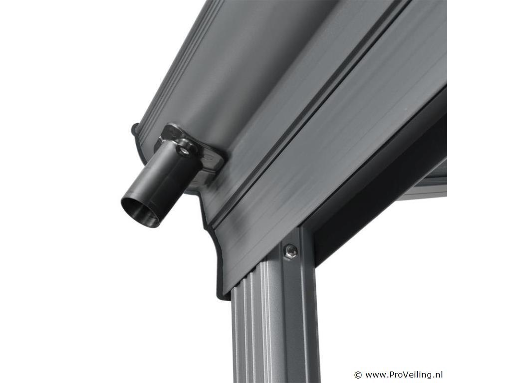 Bent u op zoek naar een moderne, stabiele en hoogwaardige zonwering? De 4×3 m aluminium terrasoverkapping Borneo (antraciet) is de perfecte overkapping voor uw terras. Door de robuuste metalen constructie en de elegante uitstraling dient het dak jarenlang als stijlvolle zonwering. Of het nu gaat om de felle zon of een regenbui - de terrasoverkapping biedt u bescherming tegen regen en schadelijke UV-straling. Zo breng je je vrije tijd altijd ontspannen buiten door. Want met de betrouwbare overkapping ben je goed beschermd! Tegelijkertijd beschermt het ook je geliefde tuinmeubelen tegen weersinvloeden. Technische specificaties: Materiaal frame: aluminium gepoedercoat Materiaal aansluitingen: verzinkt staal Materiaal dak: polycarbonaat met UV-coating Kleur frame & webplaten: donkergrijs Aantal berichten: 3 Aantal regengoten: 2 Aantal kanaalafvoer: 3 Dakdruk draagvermogen: 70 kg/m2 Windkracht: Tot 100 km/u (windkracht 10) Afmetingen (ongeveer): Breedte: 435cm Diepte: 303 cm Hoogte voorkant: 212 cm Hoogte voorzijde: 226 cm Hoogte achter: 278 cm Metaaldikte: 1 mm Dikte dubbelwandige platen: 6 mm Afmetingen paal: 4 x 10 cm Leveringsomvang: 1 x terrasoverkapping 1 x instructie