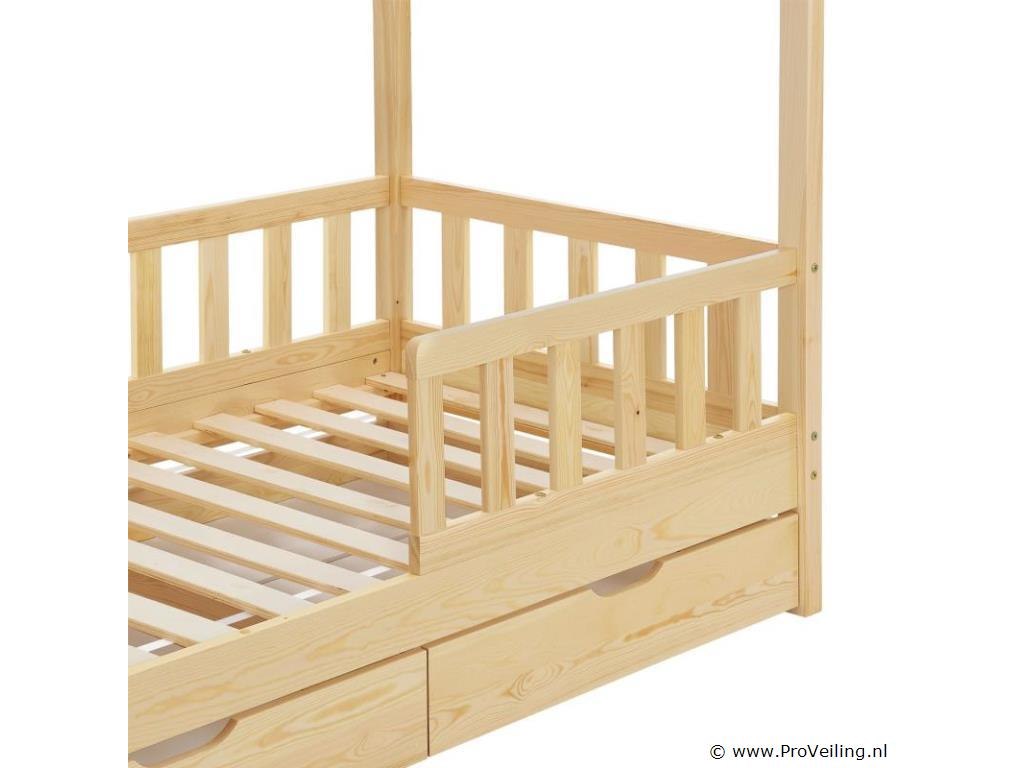 Het kinderbed Marli (160x80 cm, houtkleur) met bedstee, valbeveiliging en lattenbodem maakt indruk op meisjes en jongens van 3 tot 10 jaar. Verfraai de kinderkamer met het moderne huisbed, een slaapplek, speelbed en opbergruimte in één. Speelgoed kan netjes worden opgeborgen in de grote 2-delige bedbak. En de huislook met dak biedt vele vormgevingsmogelijkheden - als grot of met een betoverende luchtdecoratie. Uitgerust met een rail biedt het bed ook meer bescherming en veiligheid voor jonge kinderen. Het houten bed van massief en onderhoudsvriendelijk grenenhout is de juiste keuze voor langdurig gebruik. Technische specificaties: Materiaal lijst: grenenhout Materiaal lattenbodem: hout, 13 latten Kleur houtkleur Maximale belasting: 125 kg Maximale belasting per lade: 25 kg Aantal lades: 2 Matras: Geen Afmetingen (ongeveer): Totale afmetingen (BxLxH): 87x167x154 cm Ligvlak (BxL): 80x160 cm Bedstee (BxDxH): 78x84x14 cm Leveringsomvang: 1 x kinderbed 80x160 cm 1 x lattenbodem 1 x dak 2 x bedlade 1 x Instructie