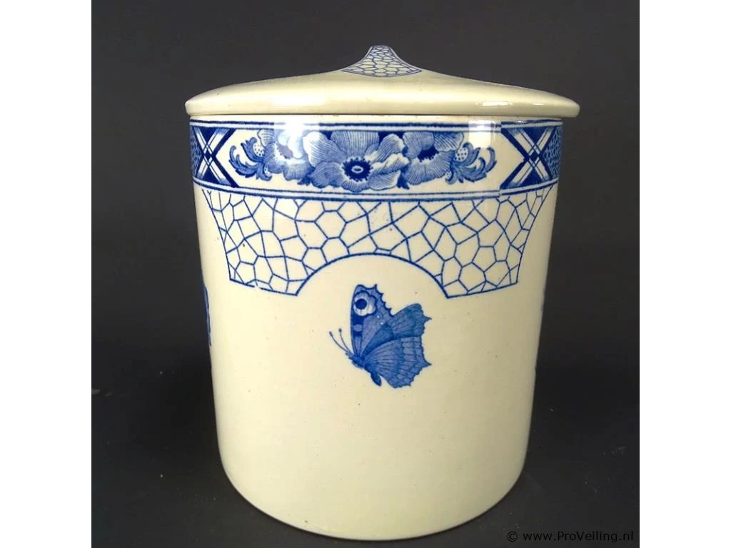 Societé Ceramique Maestricht voorraadbus. Decor Butterfly. Aan onderzijde gemerkt. H15cm/D14cm/780Gr. Dit betreft een tijdens transport kwetsbaar product! Uw transportrisico voor deze kavel is zeker in combinatie met andere kavels hoog. Lees daarom a.u.b. ook de extra veilinginformatie voor deze veiling!.