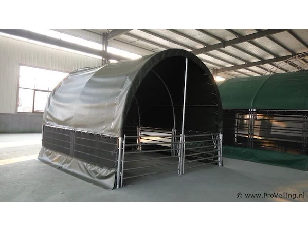 4m cattle tent; Whole Cover: 420g PVC cover; LET OP! KLEUR: WIT Size: W4* L4* H3.15 m Single Trussed, Galvanized tube frame Arches: 60*1.8mm : Purlin: 40*1.5mm Fence: 40*1.2mm With whole cover