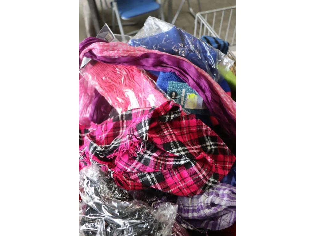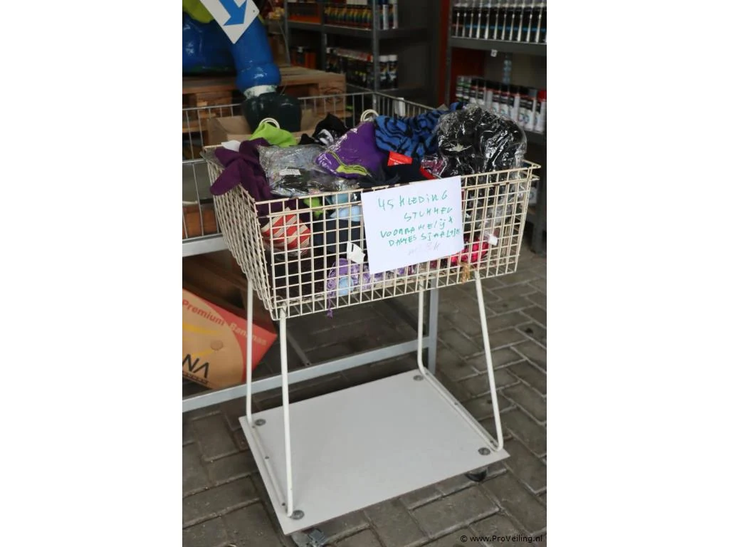 Draadmand op wielen incl. Partij nieuwe kledingstukken bestaande uit vnl. diverse sjaals; zie afbeeldingen.