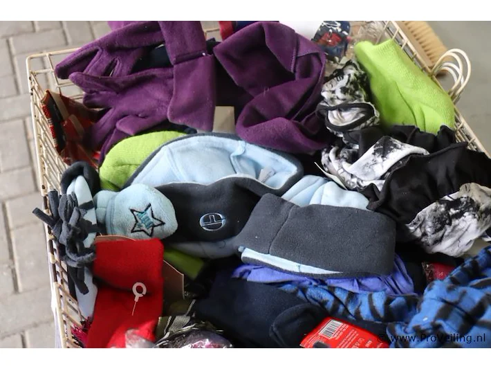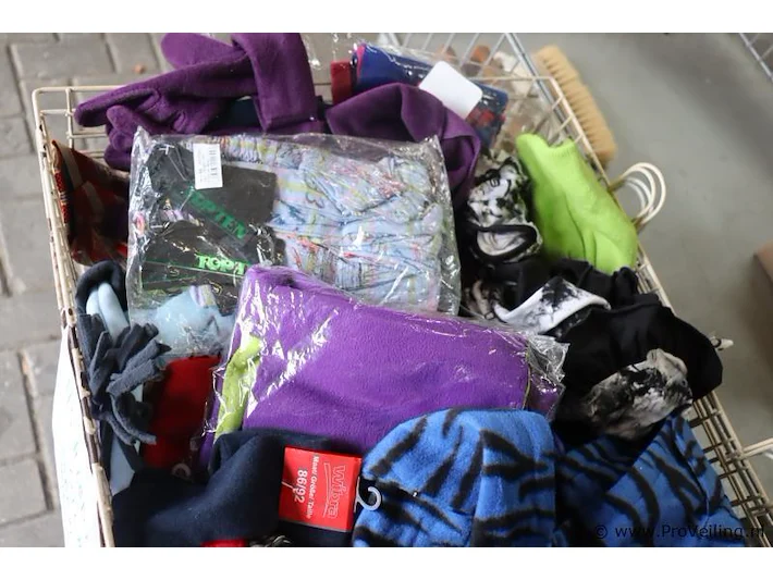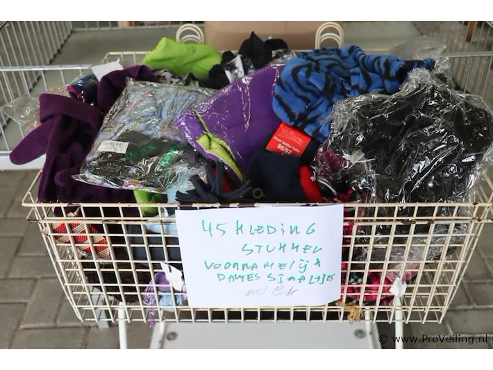 Draadmand op wielen incl. partij kledingstukken bestaande uit vnl. diverse sjaals