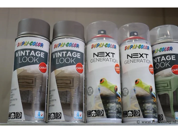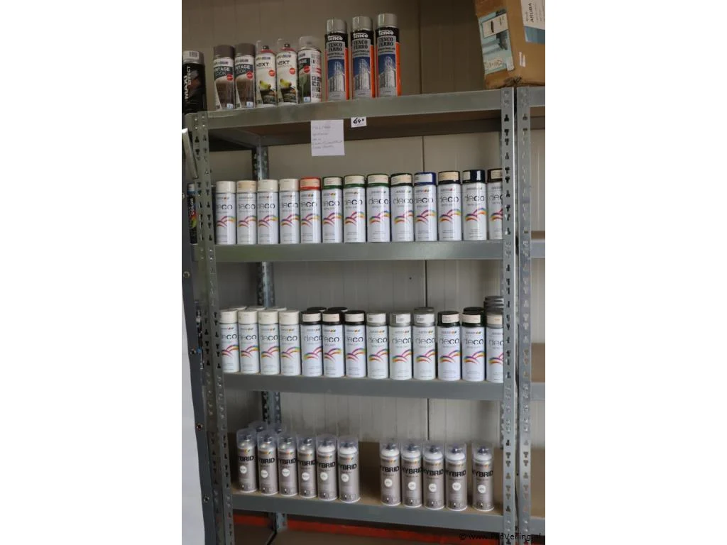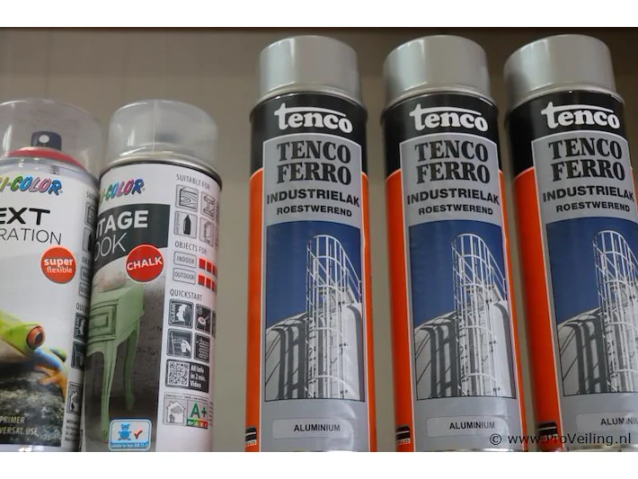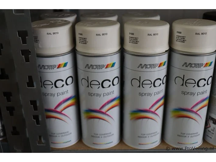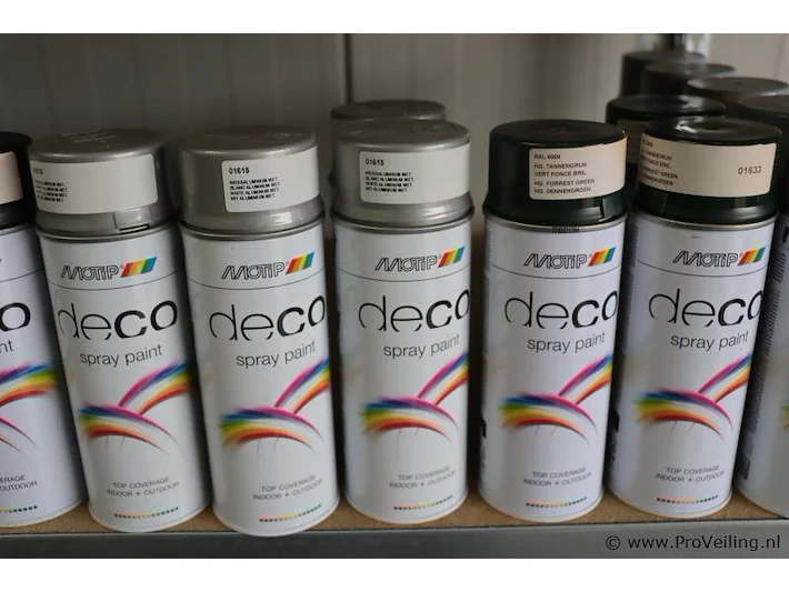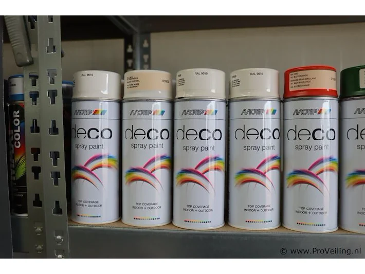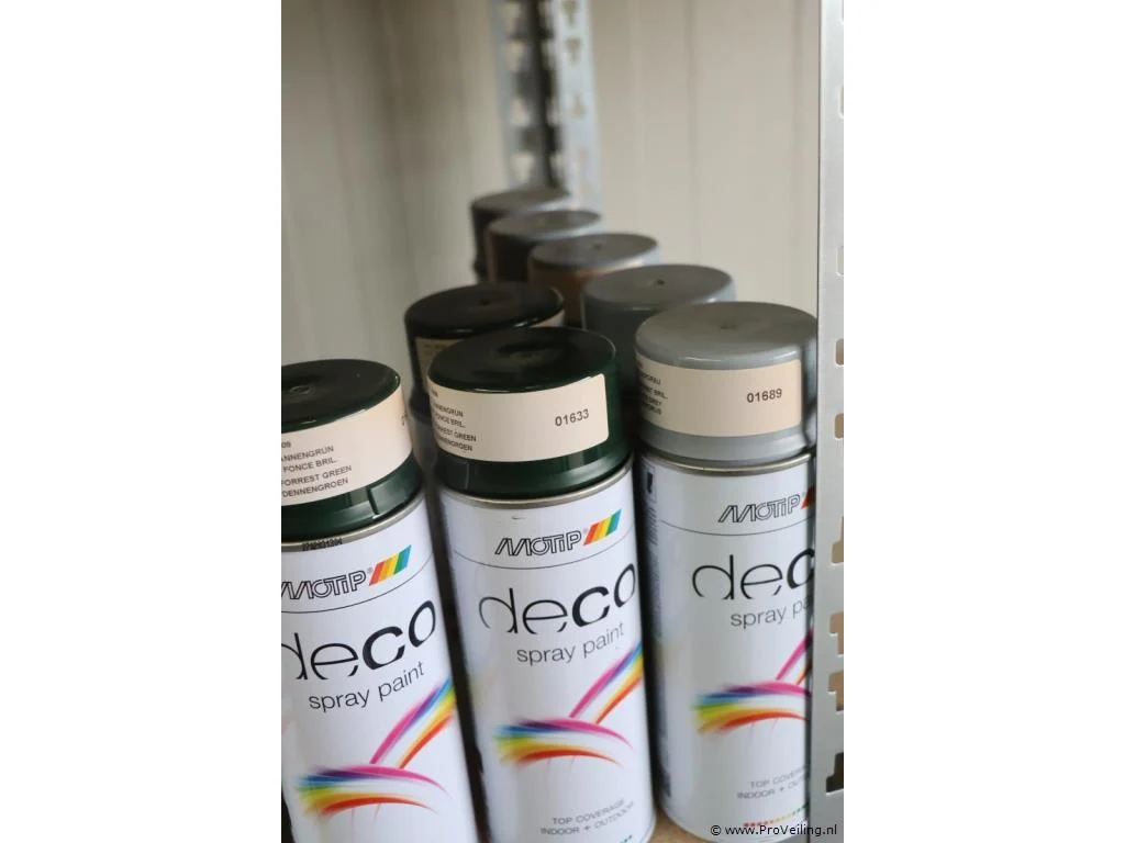 Partij spuitbussen: merk Motip en Tenco; geschikt voor binnen en buitengebruik; diverse kleuren; aantal ca. 64 bussen á 400ml.