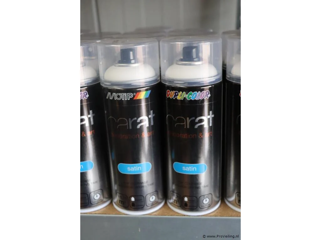 Partij spuitbussen: merk Motip en Colorspray; geschikt voor binnen en buitengebruik; diverse kleuren; aantal ca. 82 bussen á 400ml.