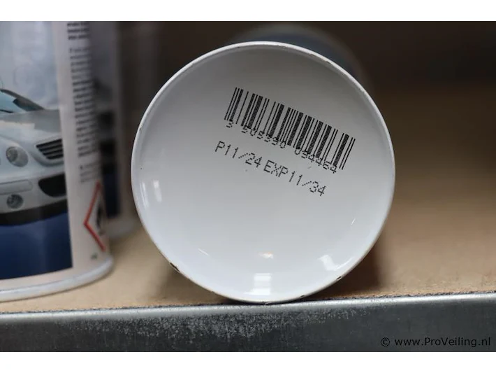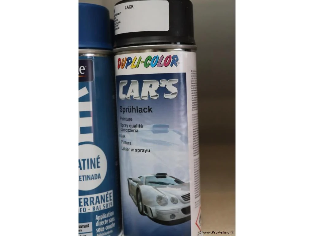 Partij diverse spuitbussen: merk Nuance/Duplicolor; RAL 5019 blauw zijdeglans & zwart zijdeglans; geschikt voor diverse ondergronden; aantal ca. 12 bussen á 400ml.