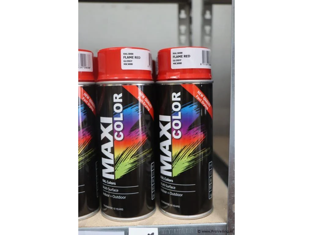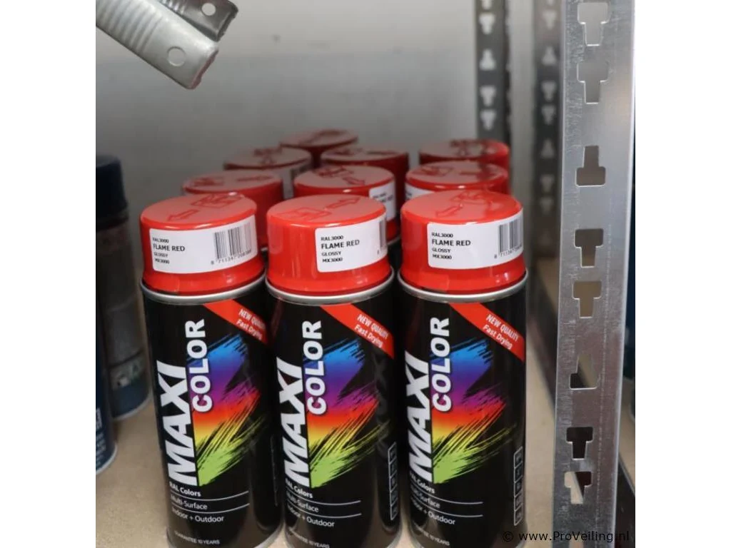 Partij spuitbussen: merk Maxicolor; geschikt voor binnen en buitengebruik; RAL 3000 vuurrood; glans; geschikt voor diverse ondergronden; aantal ca. 10 bussen á 400ml.