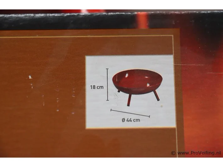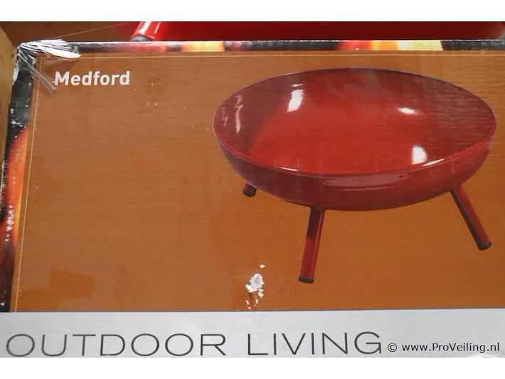 Vuurschalen: merk Medford; kleur emaille rood; afmetingen ca. 44cm (d) x 18cm (h); aantal, 2 stuks.