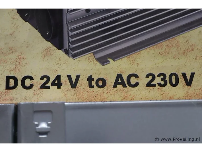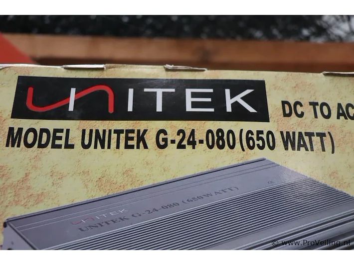 Omvormer: merk Unitek; model Unitek G-24-080 (650W); DC 24V to AC 230V.