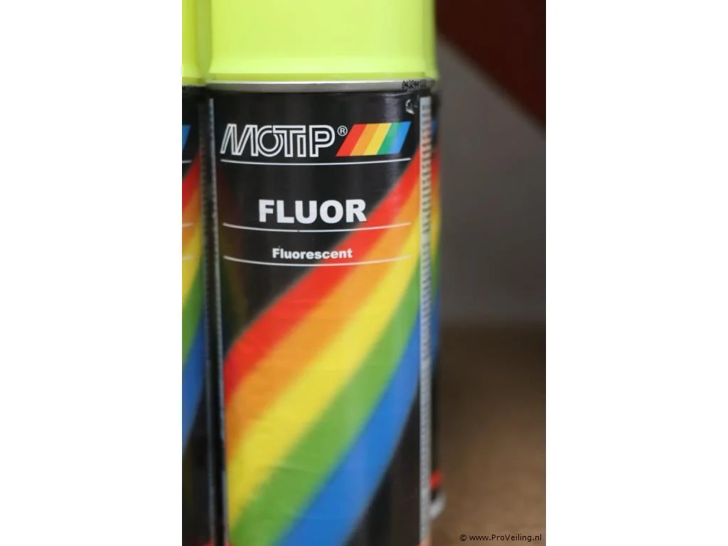 Partij Fluor lak: merk Motip; kleur Geel; geschikt voor bijna alle ondergronden; binnen/buiten gebruik; aantal ca. 10 bussen á 400ml.