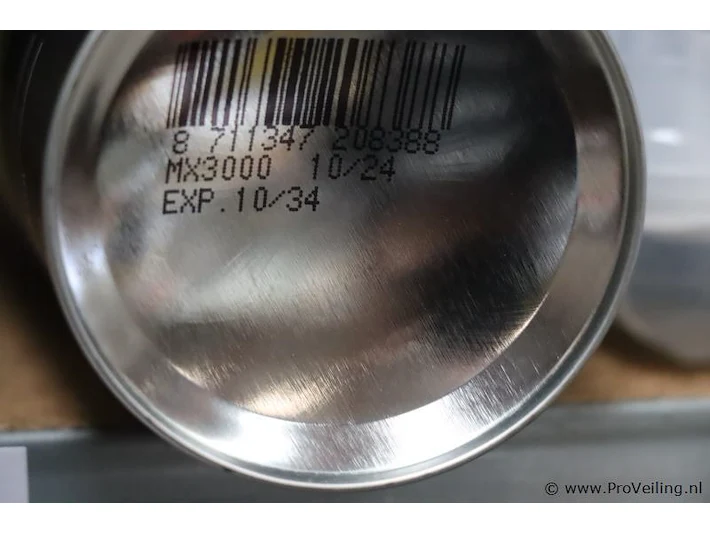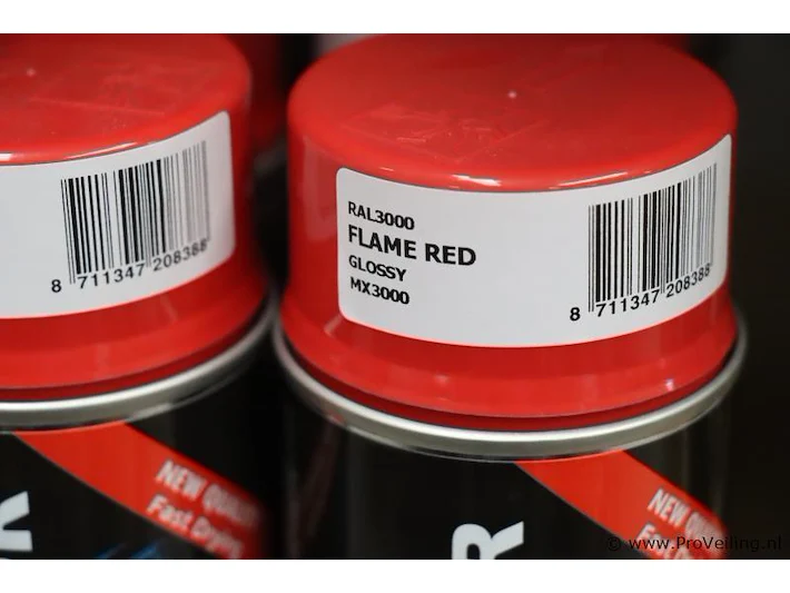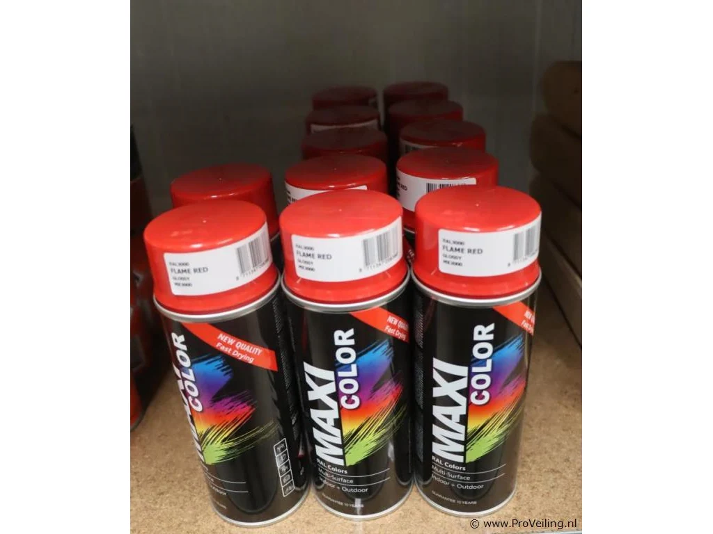 Partij spuitbussen: merk Maxicolor; kleur RAL 3000 vuurrood; voor binnen en buiten; geschikt voor diverse ondergronden; aantal ca. 12 bussen á 400ml.