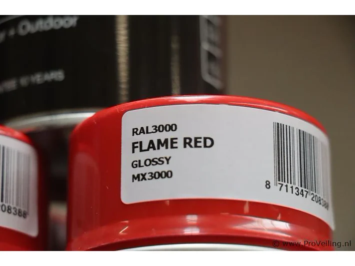 Partij spuitbussen: merk Maxicolor; kleur RAL 3000 vuurrood; glans; voor binnen en buiten; geschikt voor diverse ondergronden; aantal ca. 12 bussen á 400ml.