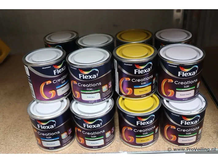 Partij lakverf: merk Flexa Creations; binnenlak; diverse kleuren; aantal ca. 24 blikken á 250ml.