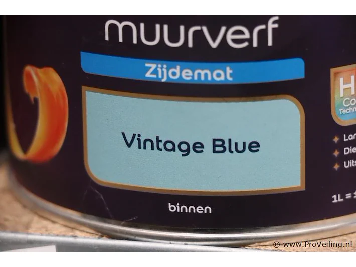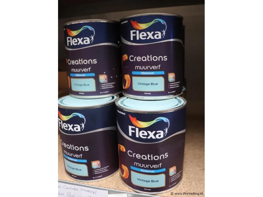 Partij muurverf: merk Flexa Creations; Zijde Mat; kleur Vintage Blue; voor binnen; aantal ca. 10 blikken á 1ltr.