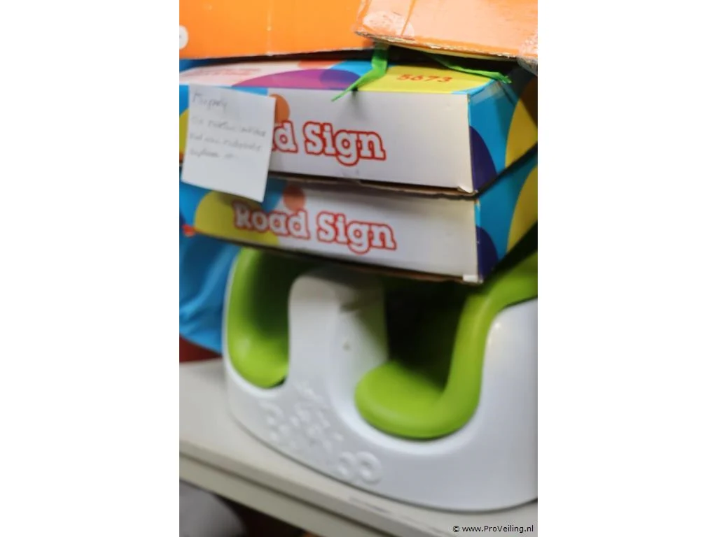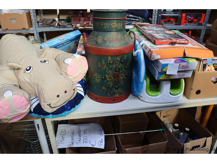 Partij diversen bestaande uit o.a. melkbus, ventilator, road signs, kinderstoeltje & stripboeken (100 stuks)