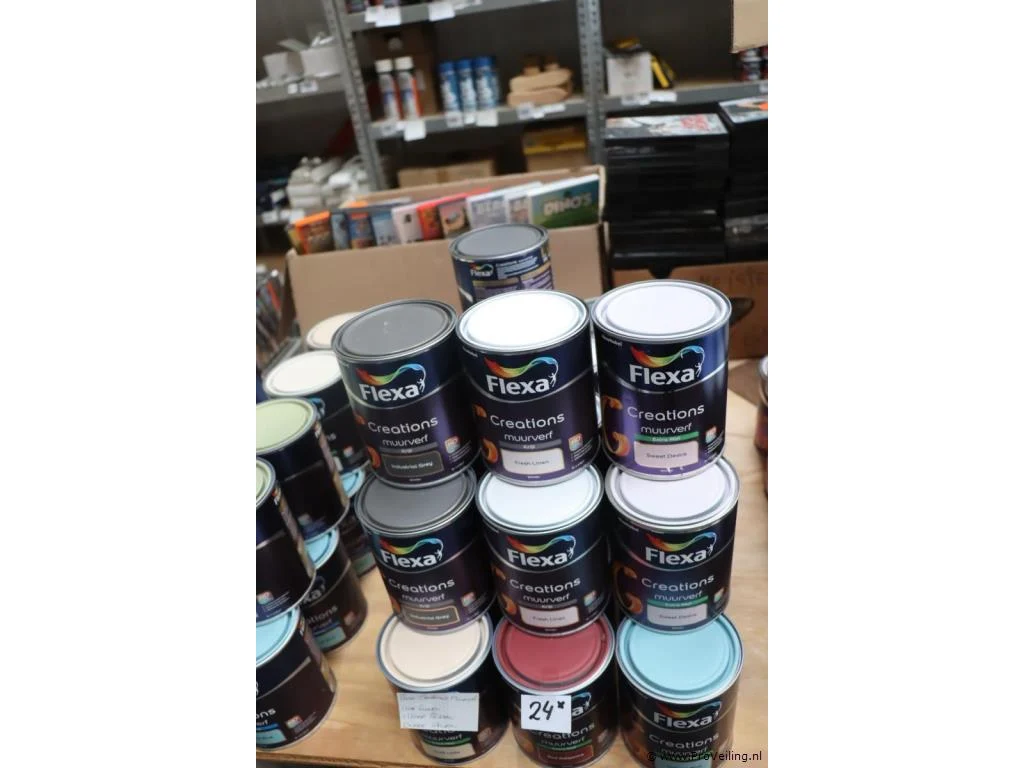 Partij muurverf: merk Flexa Creations; diverse kleuren; voor binnen; aantal ca. 24 blikken á 1ltr.