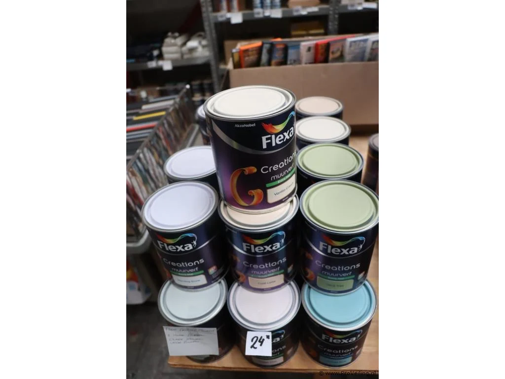 Partij muurverf: merk Flexa Creations; diverse kleuren; voor binnen; aantal ca. 24 blikken á 1ltr.