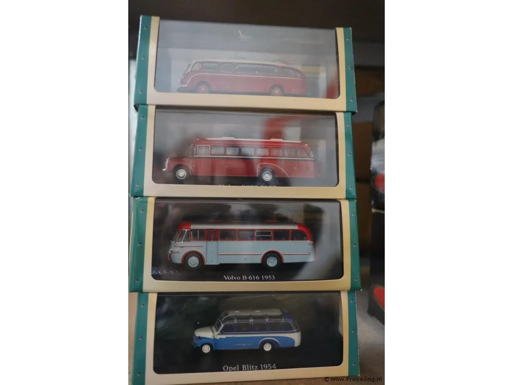 Klein schaalmodel voor volwassen verzamelaars: Bus Collection; diverse soorten o.a. Volvo B616 - 1953 & Opel Blitz -1954; aantal 4 stuks.