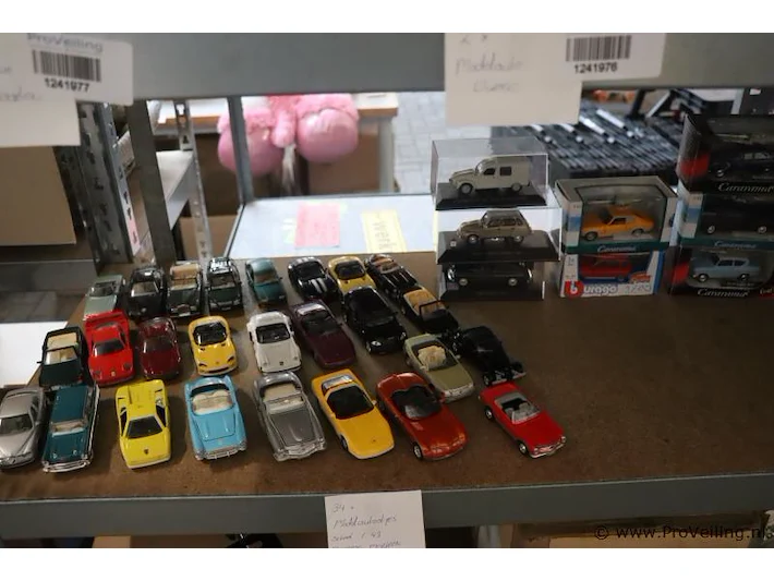 Modelauto's; schaal 1:43; diverse soorten en merken; aantal ca. 34 stuks. Het betreft hier zowel nieuw als gebruikte auto's.