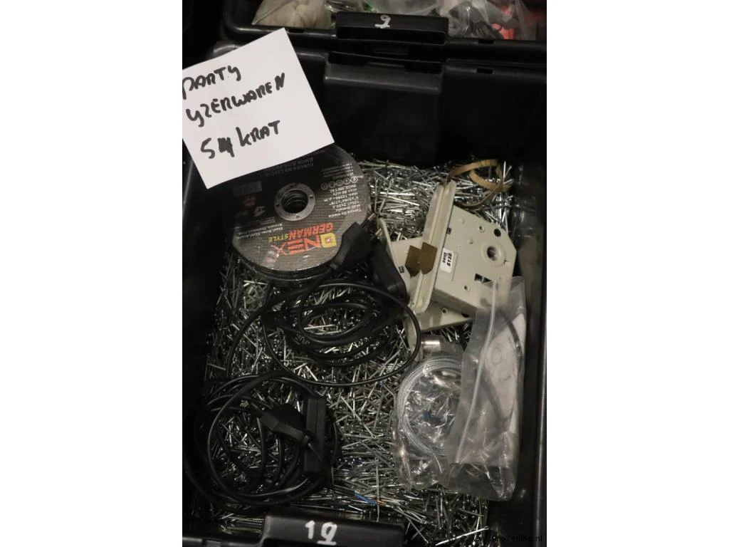 Partij ijzerwaren o.a. bouten, moeren, schroeven, ringen; totaal 5 kratten.