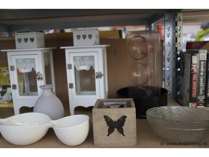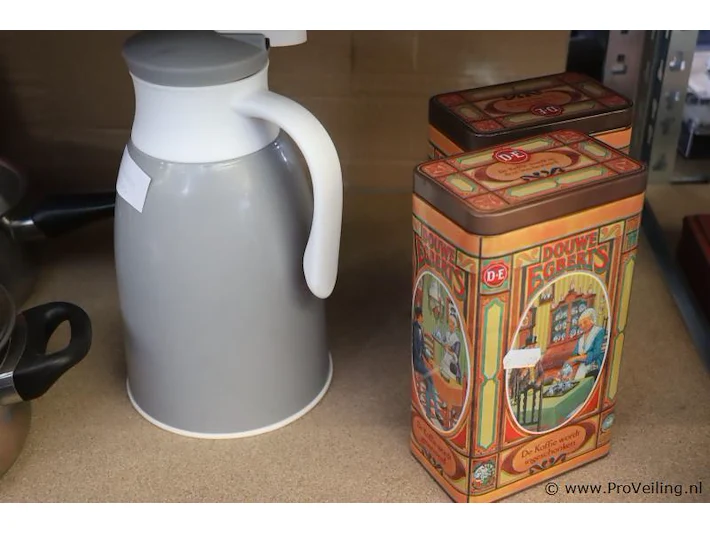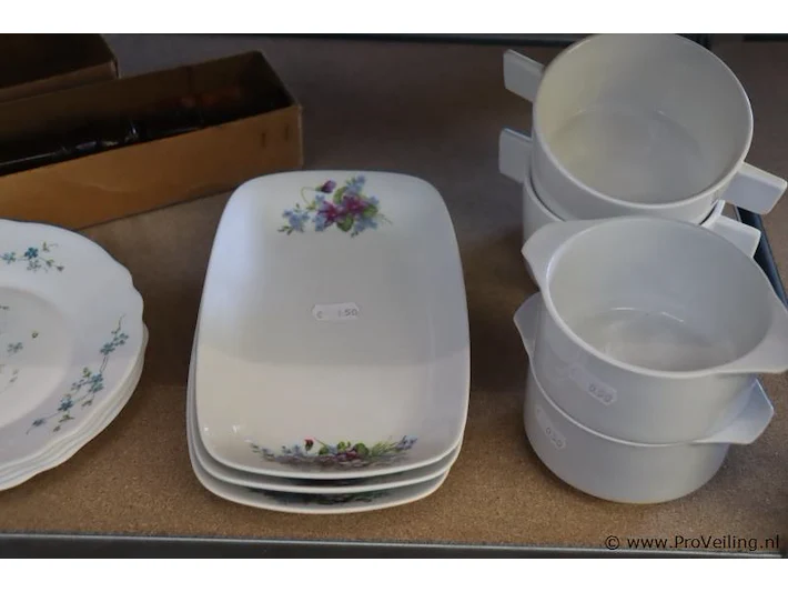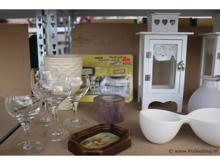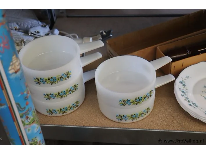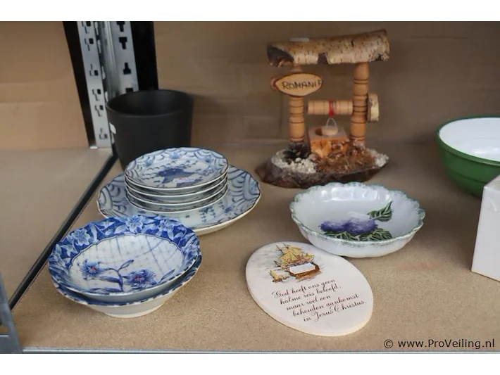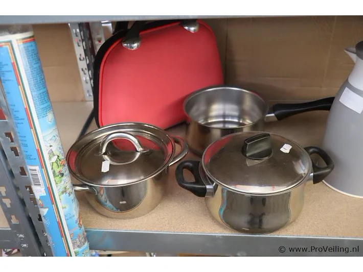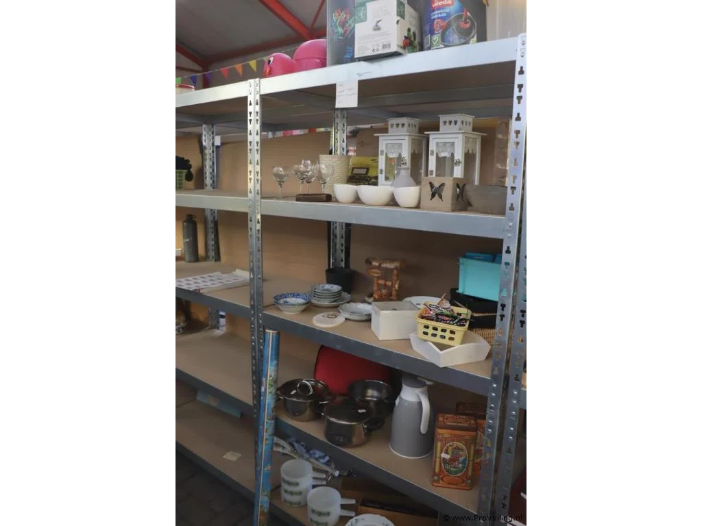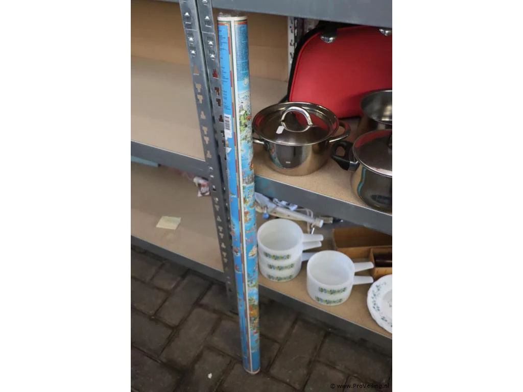 Partij diversen in stelling o.a. servies, pannen & huishoudelijke artikelen