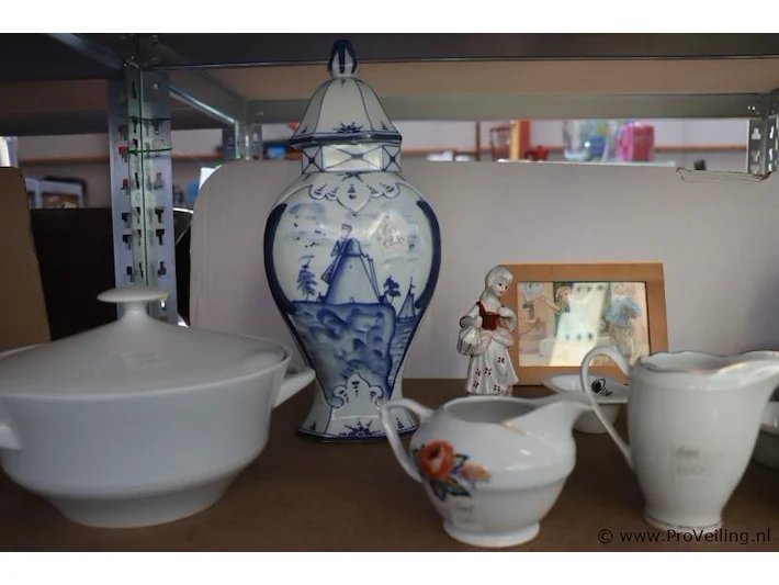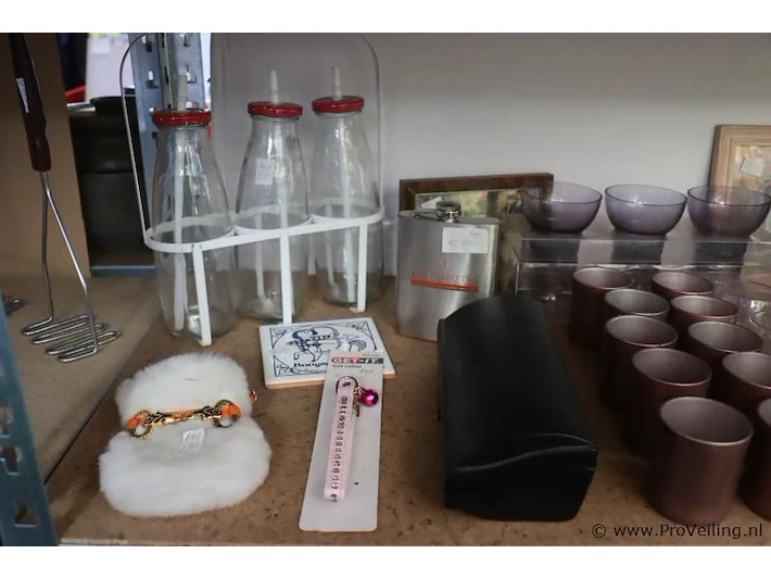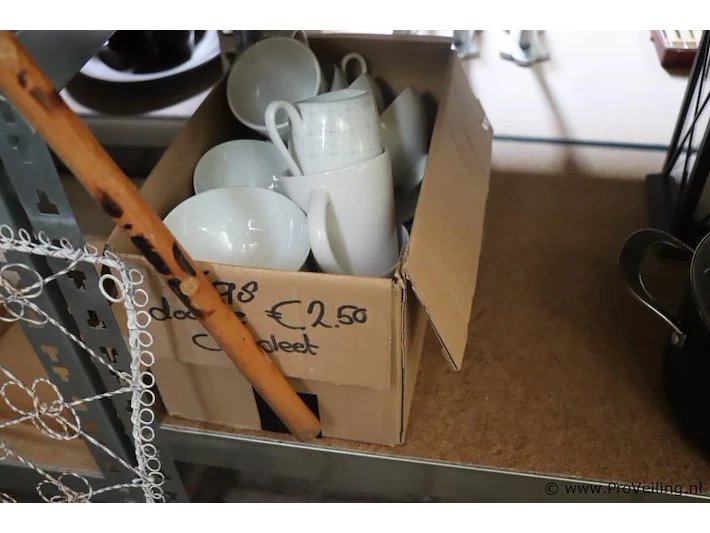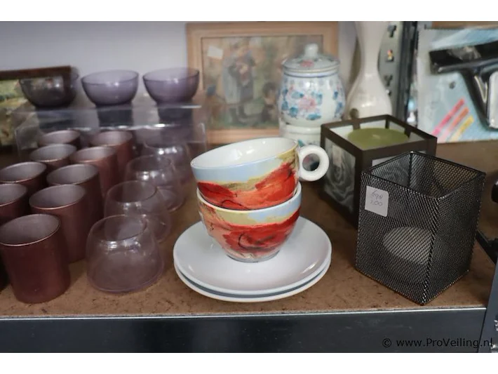 Partij diversen in stelling o.a. koffiebekers, schalen, vazen, cd's en cassettebandjes & decoratie; zie afbeeldingen.