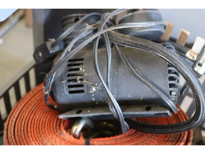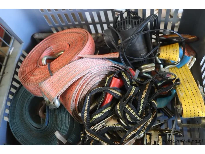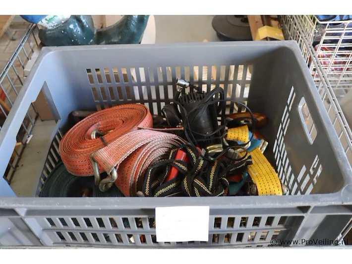 Partij diversen in krat bestaande uit o.a. spanbanden, compressor & slijpschijven; zie afbeeldingen.