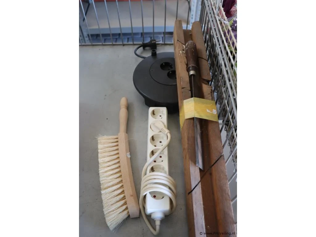 Partij diversen in krat bestaande uit o.a. spanbanden, compressor & slijpschijven
